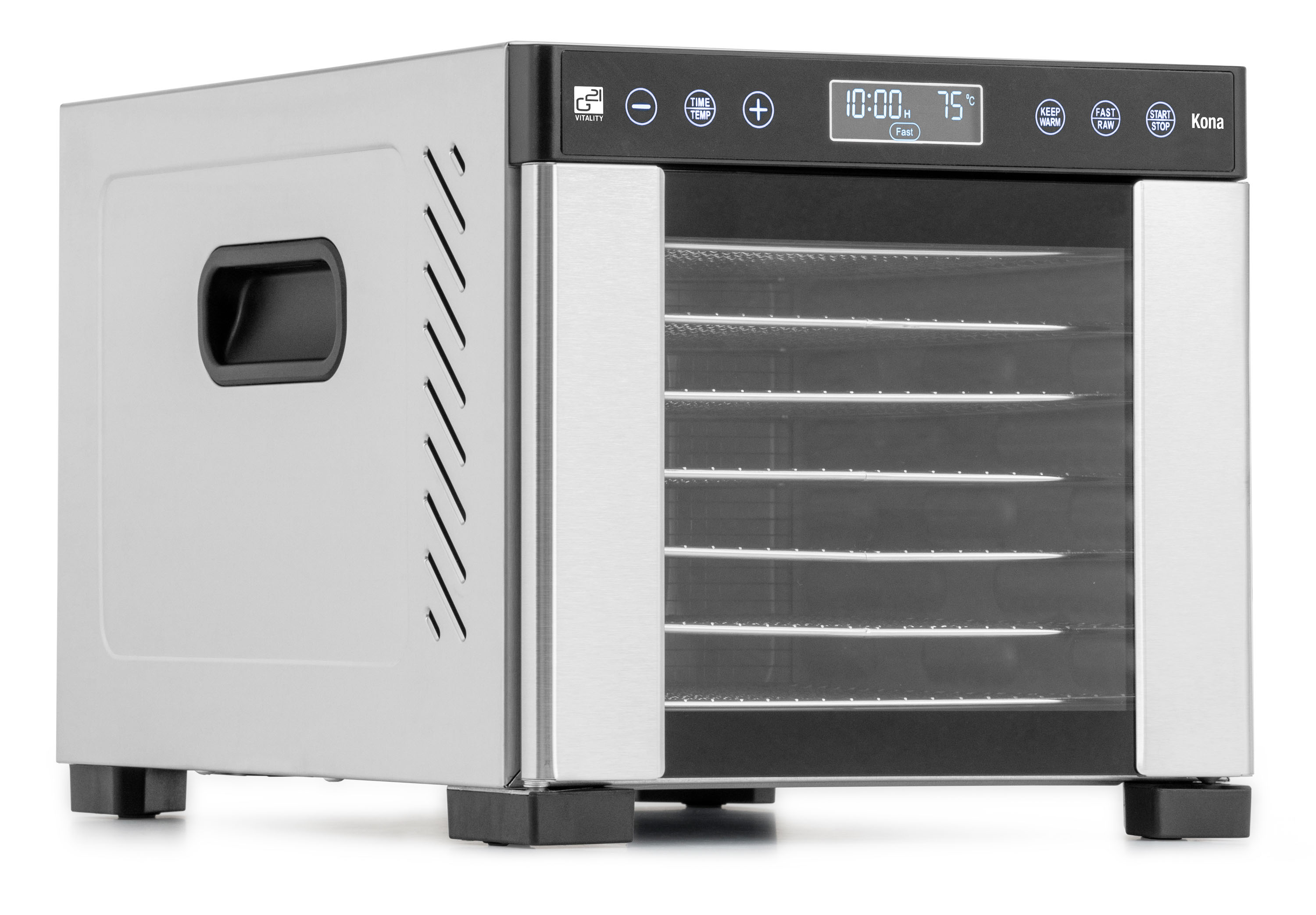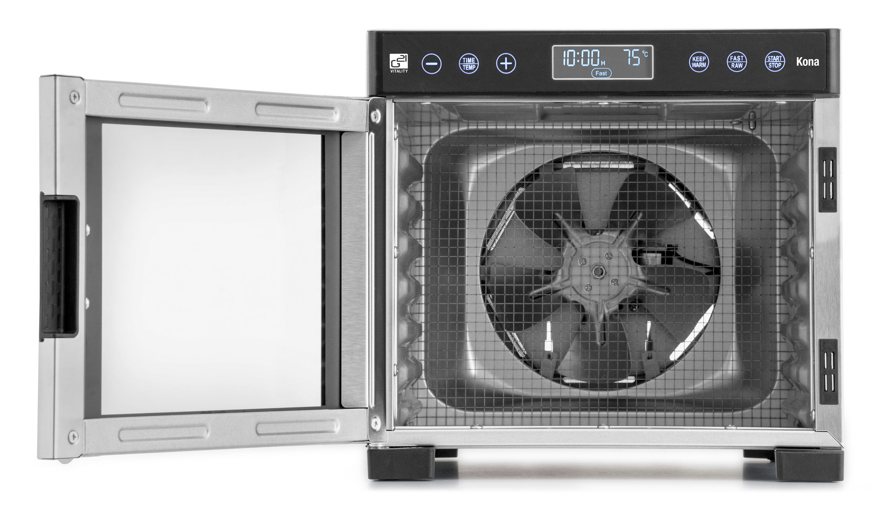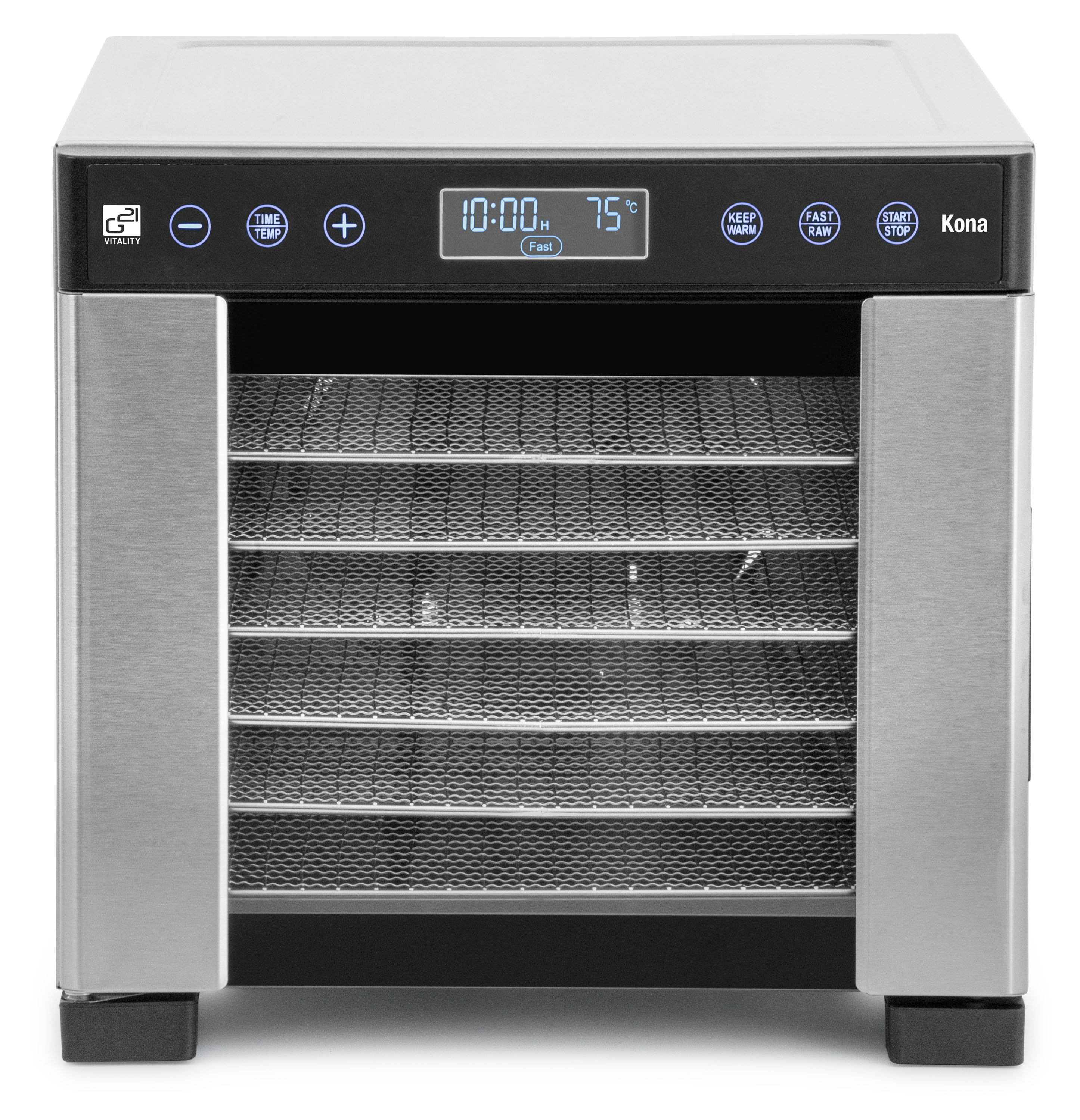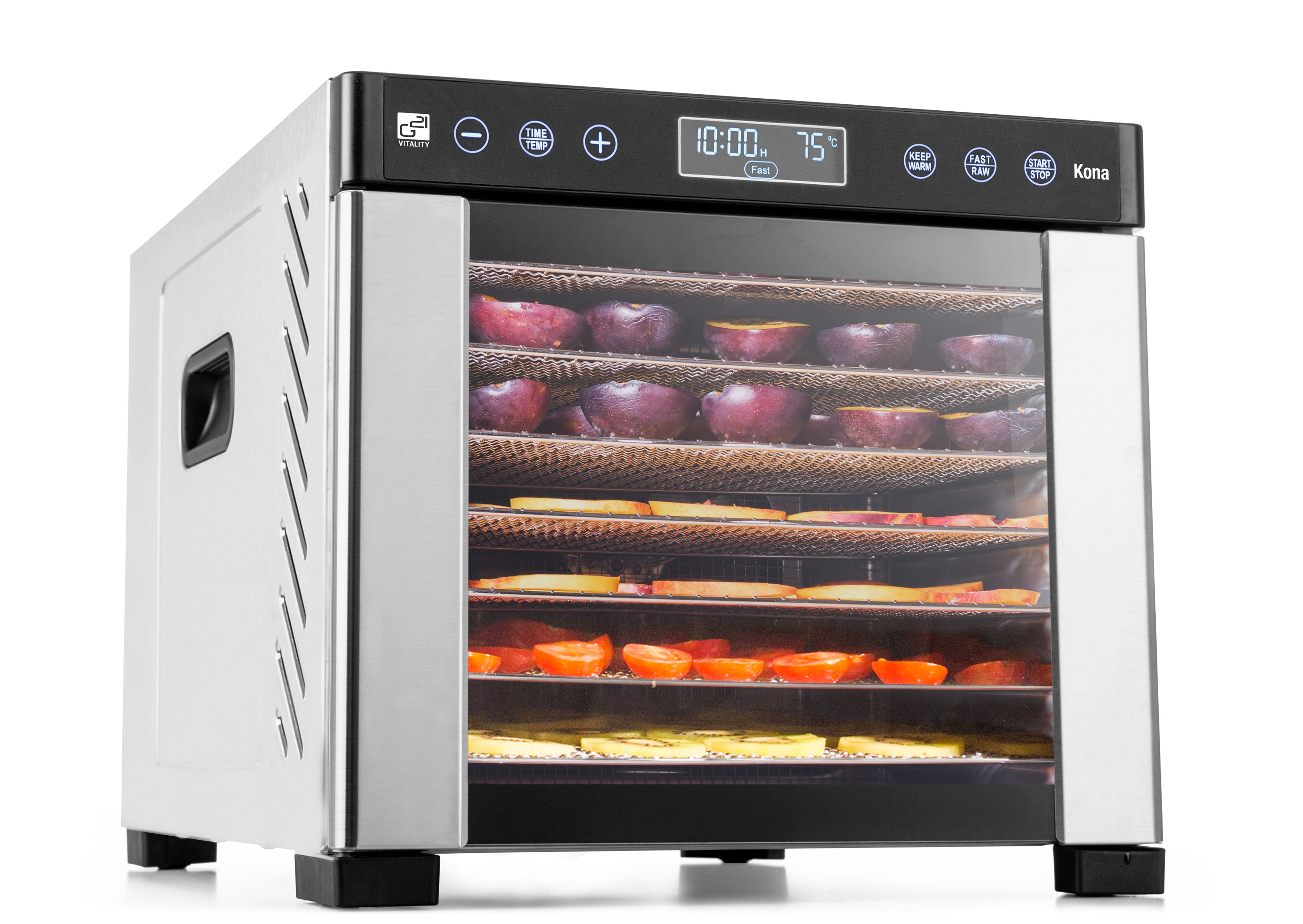 Řídící jednotka sušičky G21 Kona má dokonale řešenou elektroniku, ovládání je intuitivní a snadné. Časovač hlídá dobu přípravy a po skončení sušení sušičku sám vypne. Regulátor teploty vám dává absolutní kontrolu nad sušicím procesem. Usušte si to, co chcete, přesně tak, jak to chcete.