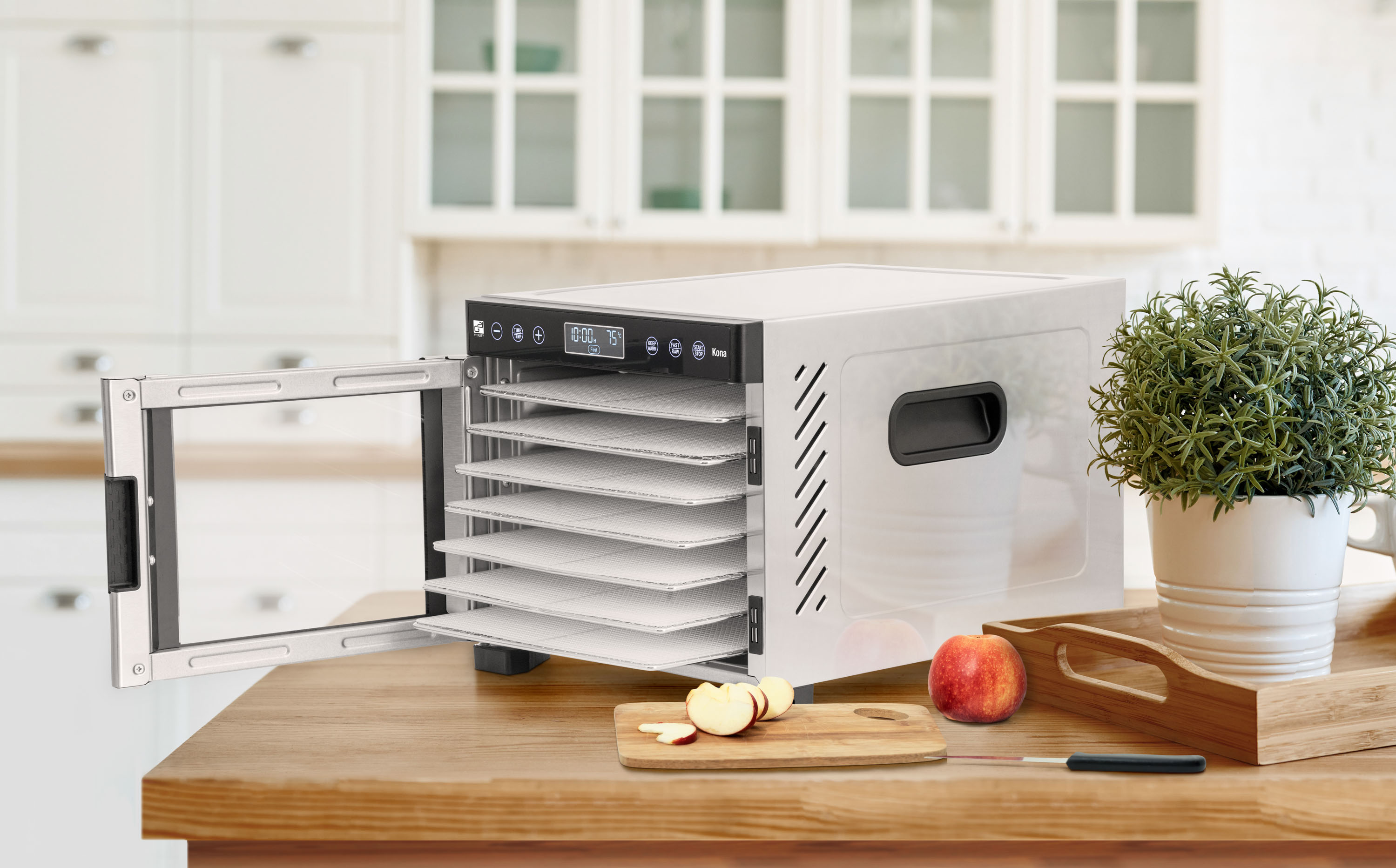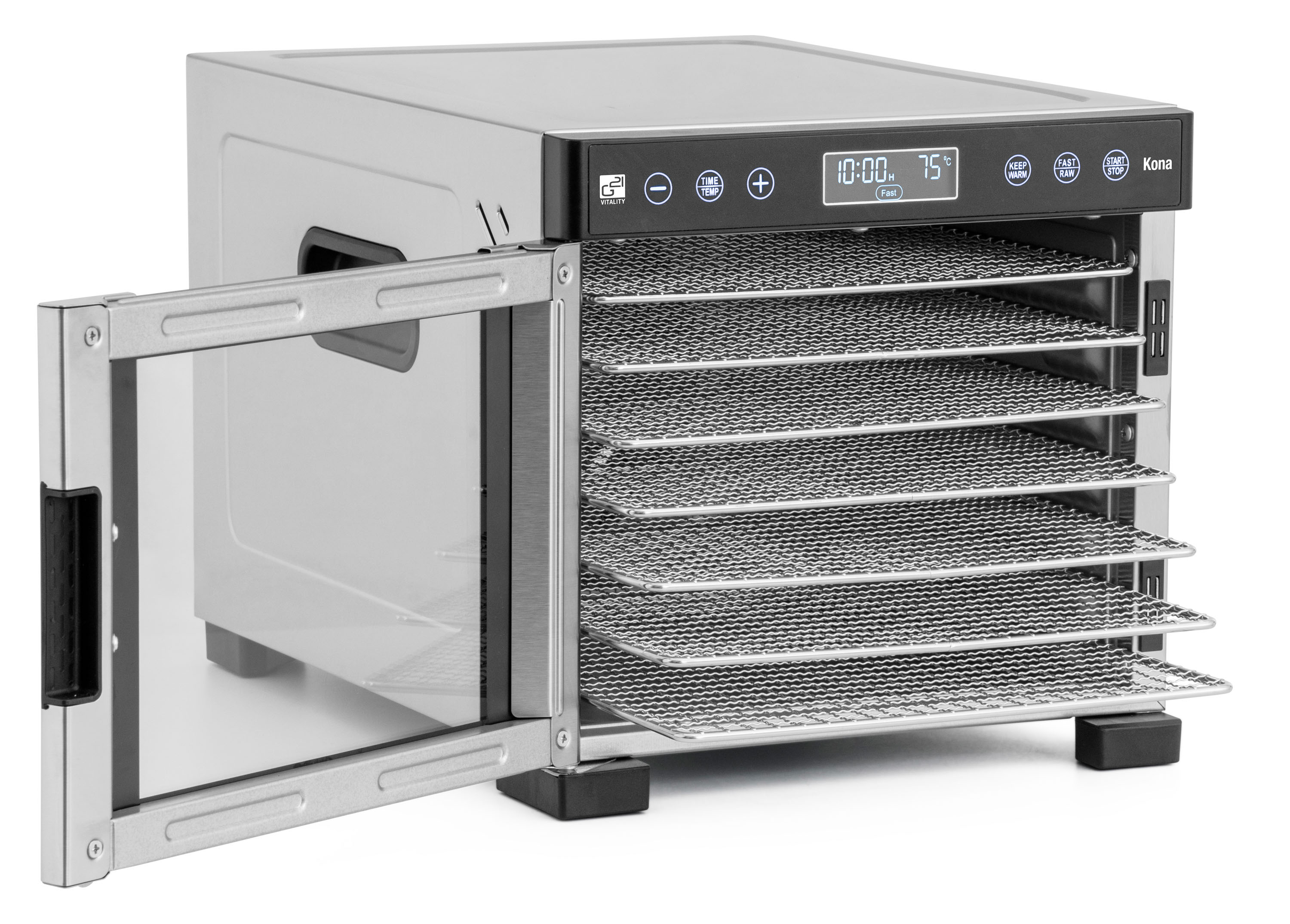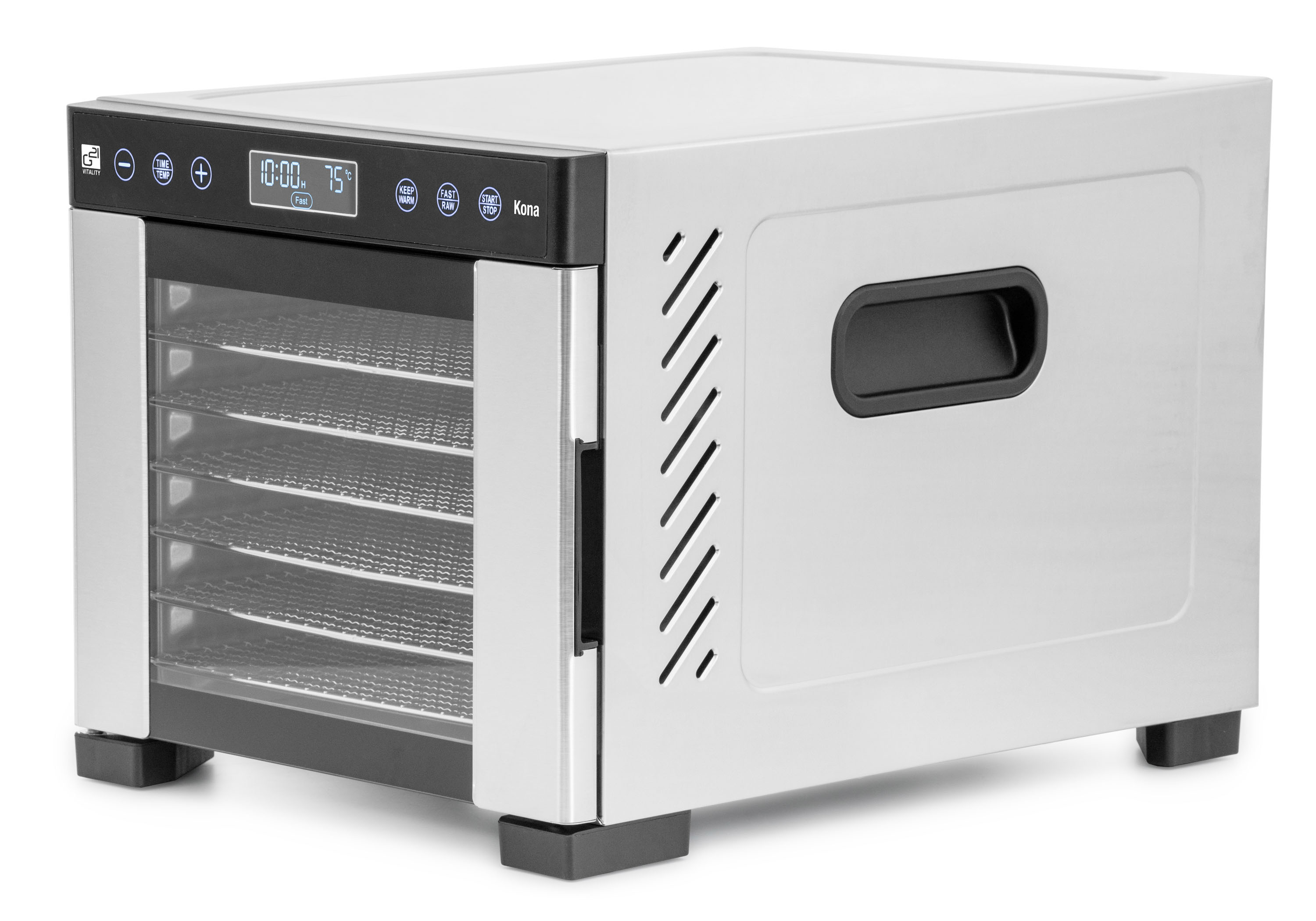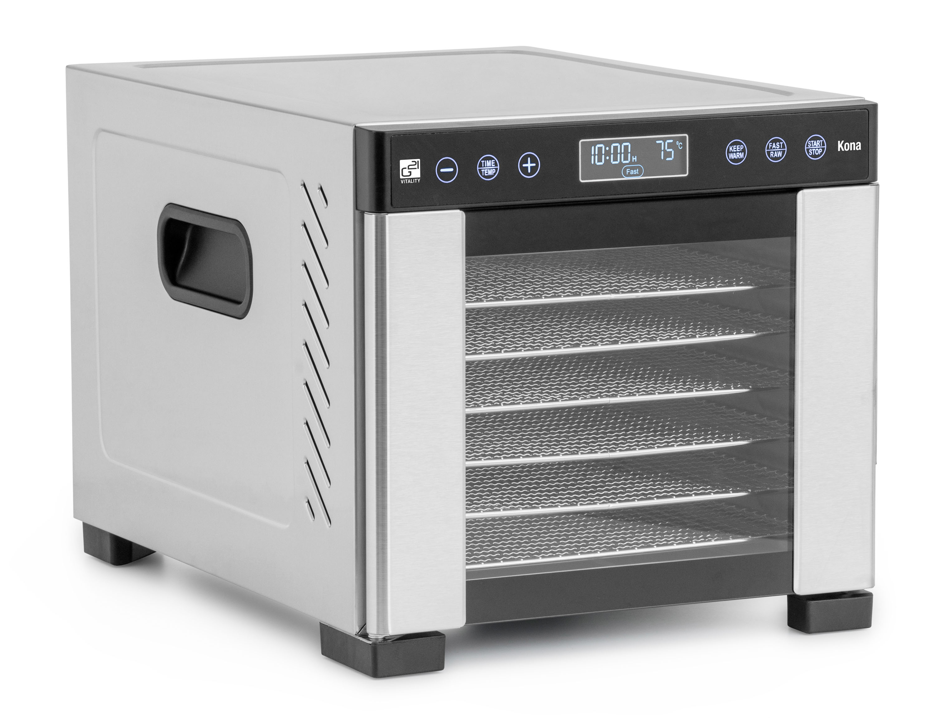 Řídící jednotka sušičky G21 Kona má dokonale řešenou elektroniku, ovládání je intuitivní a snadné. Časovač hlídá dobu přípravy a po skončení sušení sušičku sám vypne. Regulátor teploty vám dává absolutní kontrolu nad sušicím procesem. Usušte si to, co chcete, přesně tak, jak to chcete.