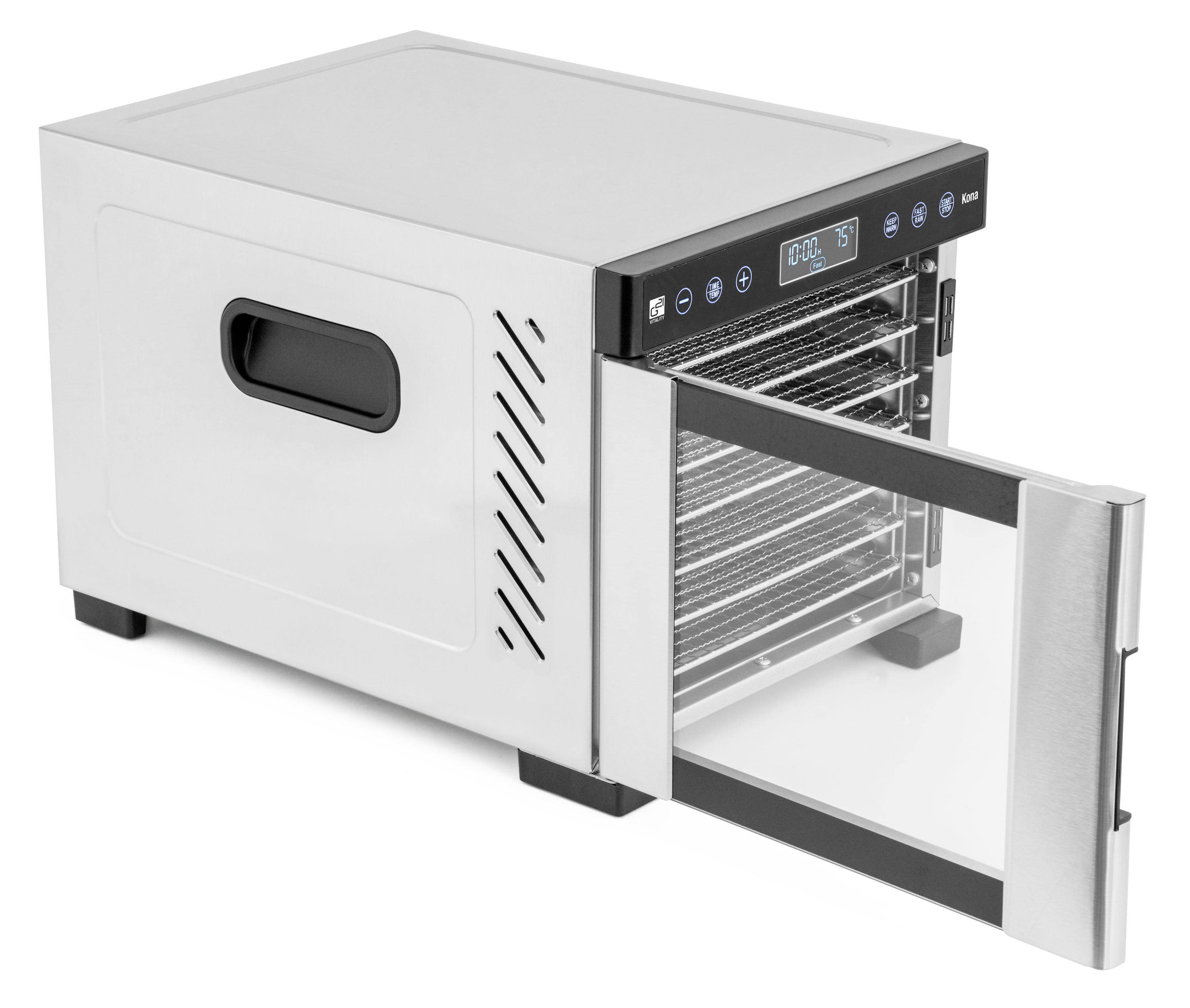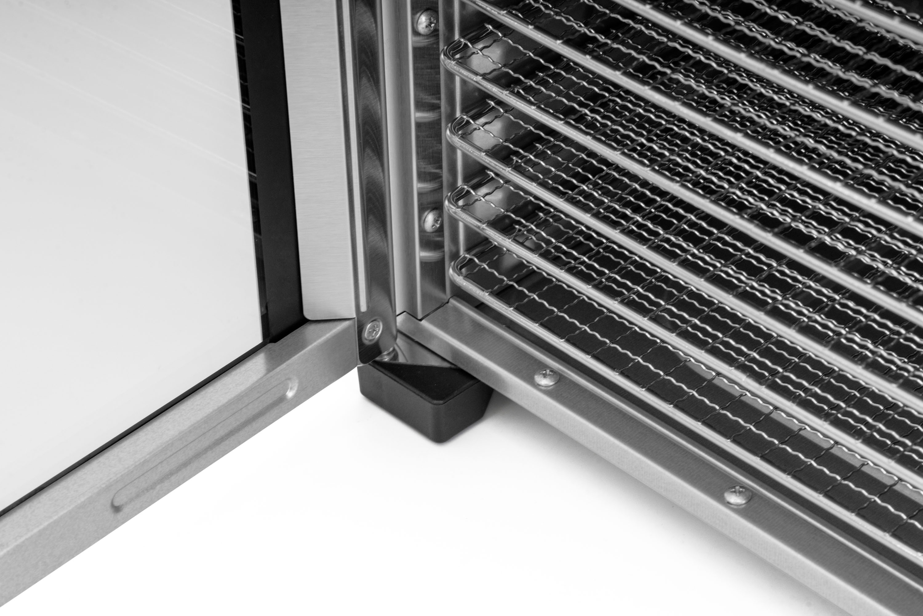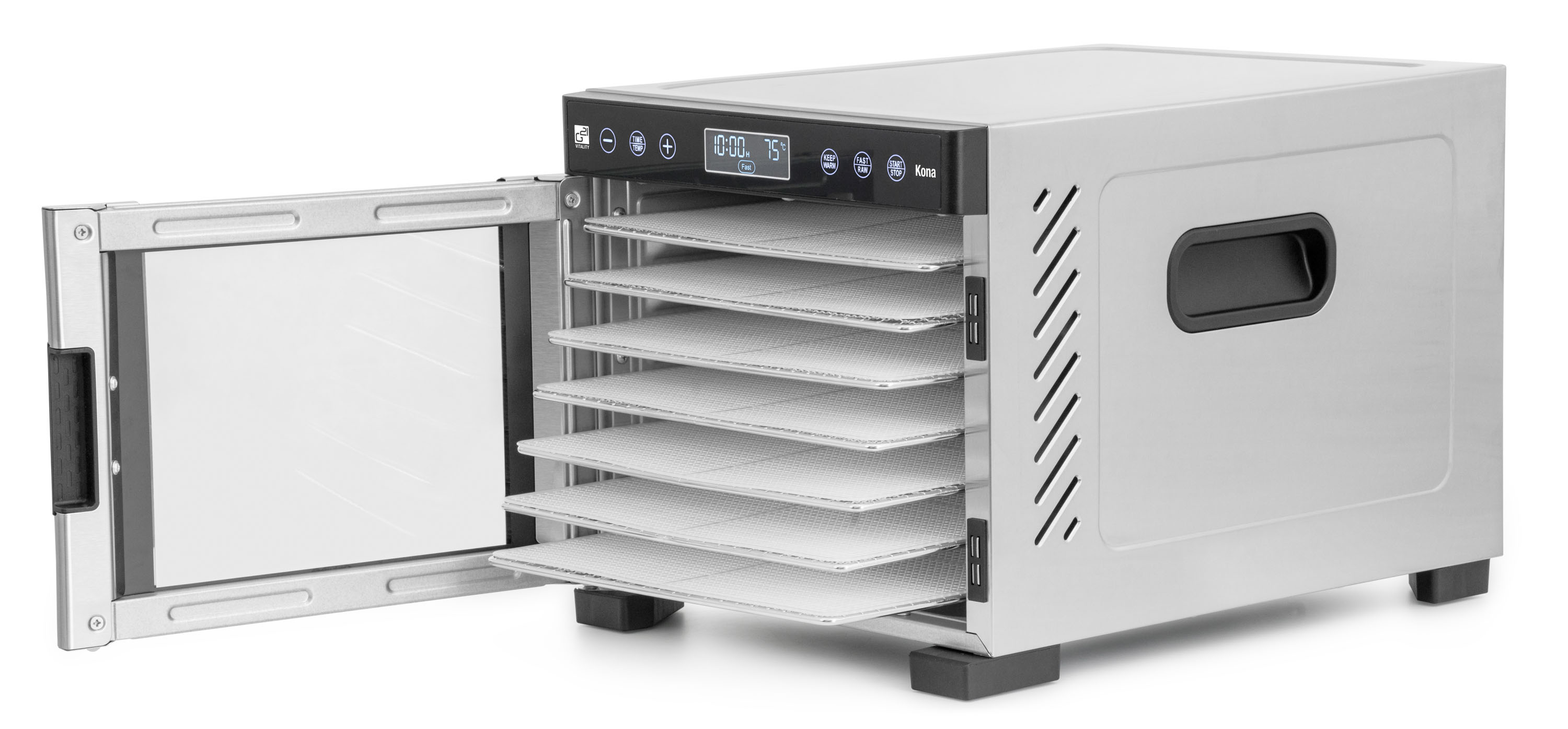 Zatímco u jiných sušiček v této cenové kategorii je ventilátor umístěný na spodní části, takže plata se sušenými surovinami musíte pro lepší usušení přesouvat, Kona je svým provedením o třídu výš. Díky strategicky umístěnému ventilátoru v ní proudí vzduch horizontálně. Dvířka s okénkem na čelní straně navíc zajišťují nižší spotřebu energie, dokonalou cirkulaci vzduchu, efektivnější sušení a zkracují dobu sušení potravin.