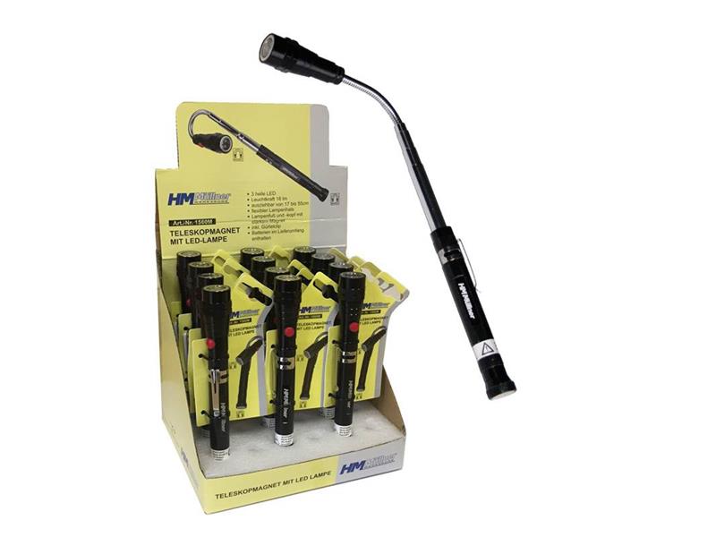 Led svítilna s teleskopickou flexibilní hlavou s magnetem. Technické parametry: - Světelný zdroj: 3 x LED - Světelný tok: 18 lm - Doba svícení: max. 2 hod - Celokovové provedení - Dva magnety - Klip na uchycení - Napájení: 4x LR44 (součástí) - Rozměr: teleskop 17 až 57cm x 21mm - Barva: černá