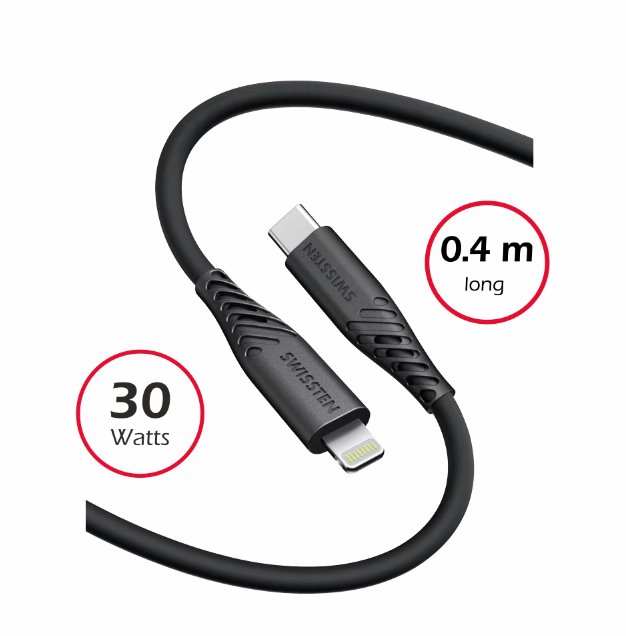 DATOVÝ KABEL SWISSTEN SOFT SILICONE USB-C / LIGHTNING 0,4 M ČERNÝ