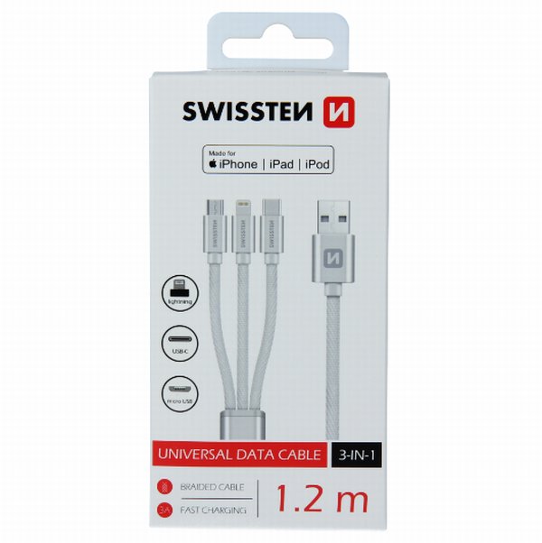 SWISSTEN DATOVÝ KABEL TEXTILE 3in1 MFi 1,2 M STŘÍBRNÝ