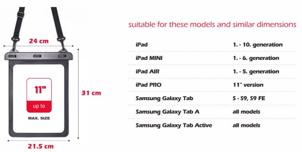 Máte zájem o ochranu Vašeho zařízení před vlhkostí a vodou? Našli jste správně. Swissten vodotěsné pouzdro pro tablety o max. velikosti 11" splní vaše požadavky. Zařízení se dá v pouzdře bez problému ovládat, fotit s ním, poslouchat muziku či telefonovat.