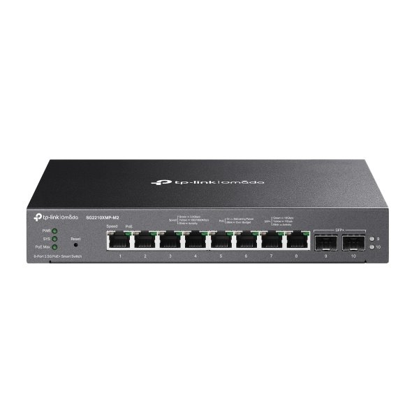 Switch TP-Link TL-SG2210XMP-M2 je vybavený celkem osmi 2,5G porty PoE+ a dvěma 10G sloty SFP+, které poskytují vysokorychlostní připojení pro spolehlivý uplink. Každý port má výstup až 30 W a dohromady dosahují celkového výkonu až 160 W. Instalovat ho můžete buď na desku stolu, nebo na zeď. Provedení bez ventilátoru zajišťuje tichý chod. Velkou výhodou je také odolné kovové pouzdro.