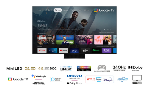 Televize Google TV, QLED, 165cm, 4K Ultra HD, PPI 4400 (144 Hz), Mini LED, HDR10, HDR10+, HLG, Dolby Vision, lokální stmívání, DVB-T2/S2/C, H.265/HEVC, 4× HDMI, 1× USB, LAN, WiFi, Bluetooth, DLNA, Chromecast, Miracast, HbbTV 2.0, herní režim, hlasové ovládání, Netflix, Disney+, HBO Max, Apple TV, Voyo, O2 TV, Steam Link, Google Assistent, Amazon…