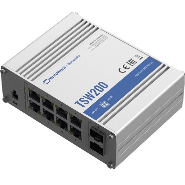 Průmyslový unmanaged switch Teltonika TSW200 od společnosti Teltonika Networks je vůbec prvním PoE+ přepínačem, který byl navržen tak, aby poskytoval svým uživatelům široké možnosti správy sítě a zároveň centralizoval distribuci napájení. Díky PoE+ je umožněna flexibilita při správě řešení a napájení, dále je vylepšená komunikace M2M s podporou široké škály průmyslových protokolů včetně EtherNet/IP, Profinet a MRP. TSW202 je vybaven 8 Gigabit Ethernet porty, z nichž každý poskytuje 30W výkonu (celkové napájení až 240W) a zároveň má 2 vysoce výkonné SFP porty pro dálkovou komunikaci pomocí optických vláken.
