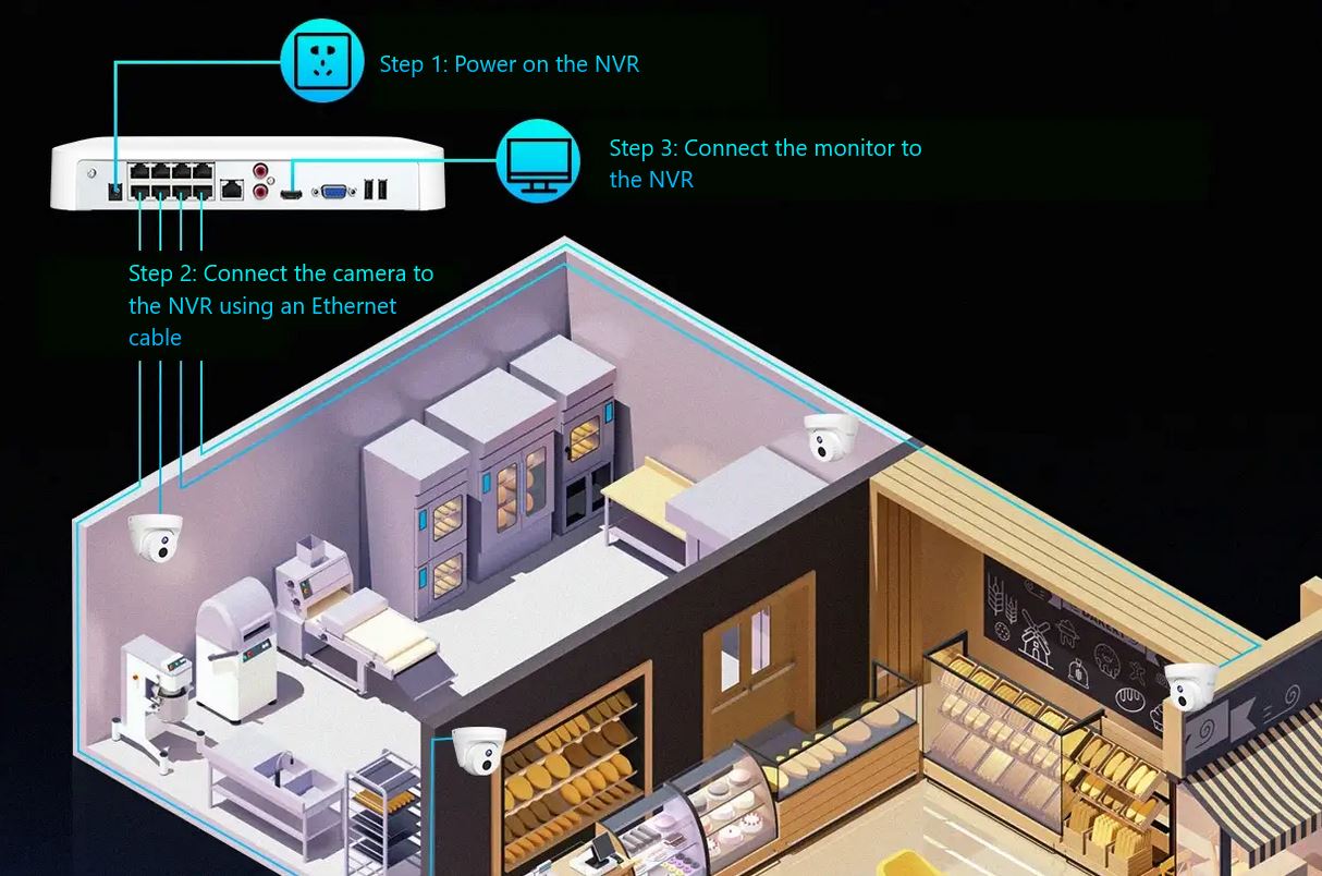 Propojení kamer a rekordéru je pomocí Ethernetového kabelu a