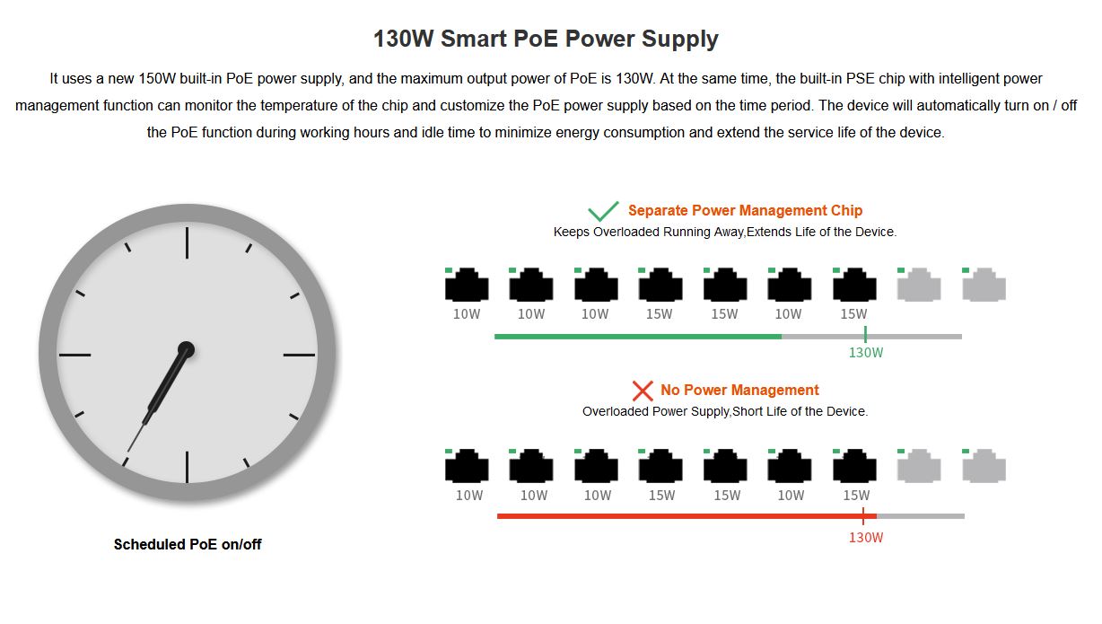 protection, Supports PoE scheduled management, Supports intelligent
