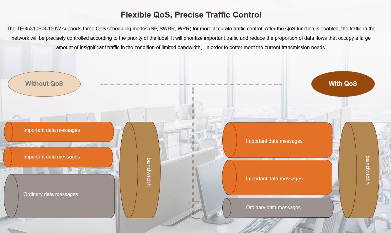 TEG5310P-8-150W podporuje tři režimy plánování QoS (SP, SWRR, WRR)