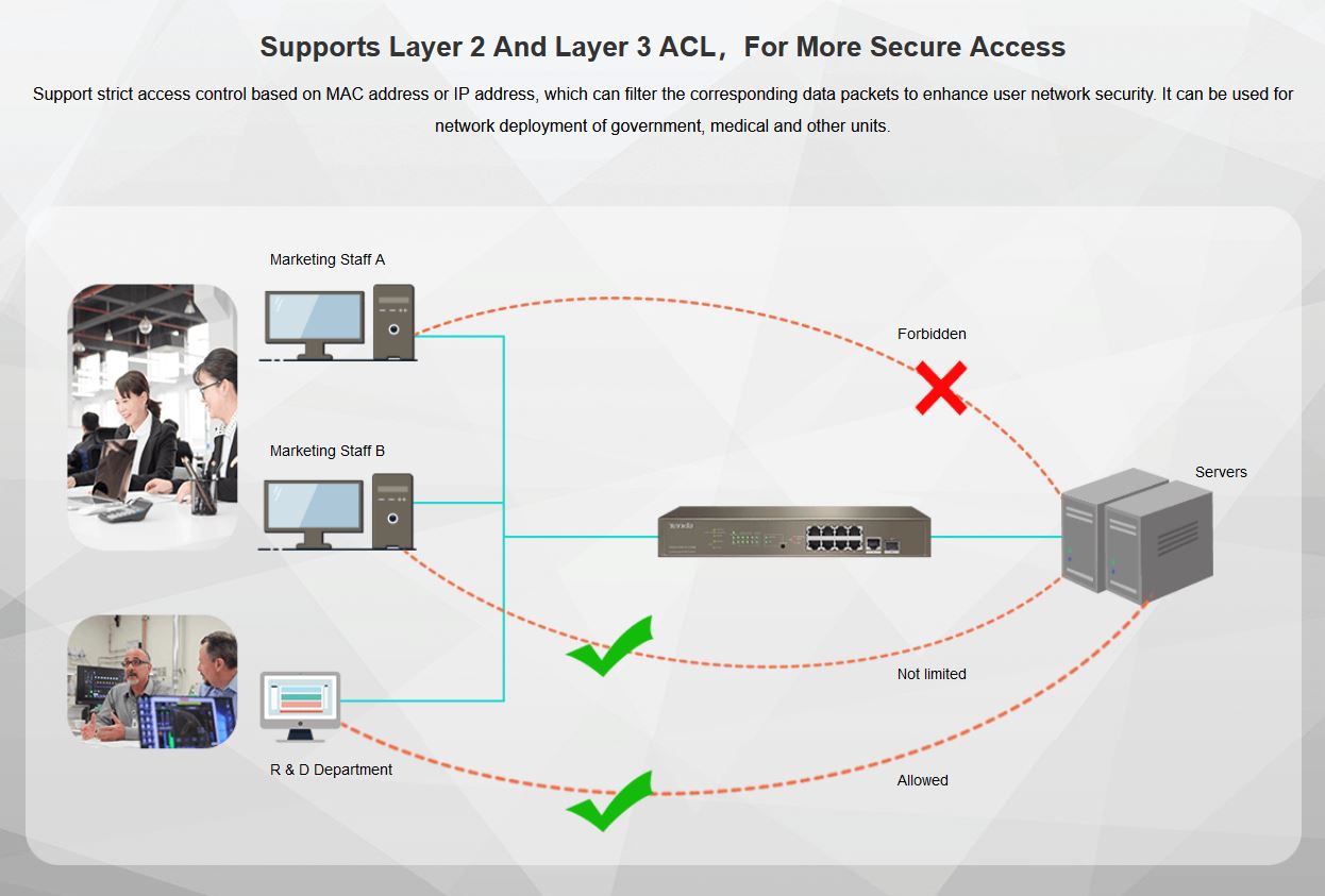 ACL: Supports MAC ACL and IP ACL
