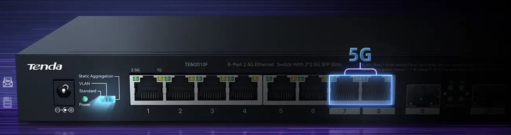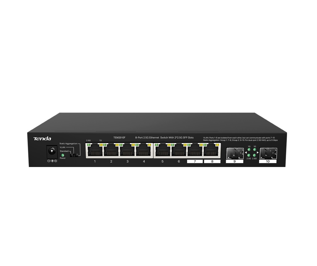 Tenda TEM2010F - 8x 2.5G RJ45 + 2x 2.5G SFP port, VLAN, MAC 16K, ochrana 6kV, propustnost 50 Gb/ s