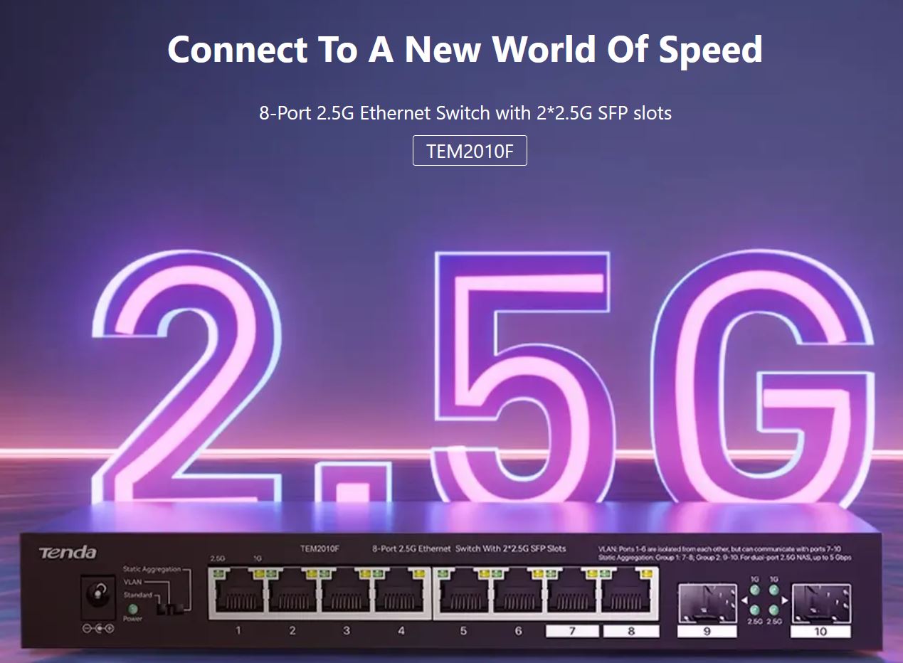 Tenda TEM2010F je 8mi portový 2.5G Ethernet switch a 2x 2.5G SFP