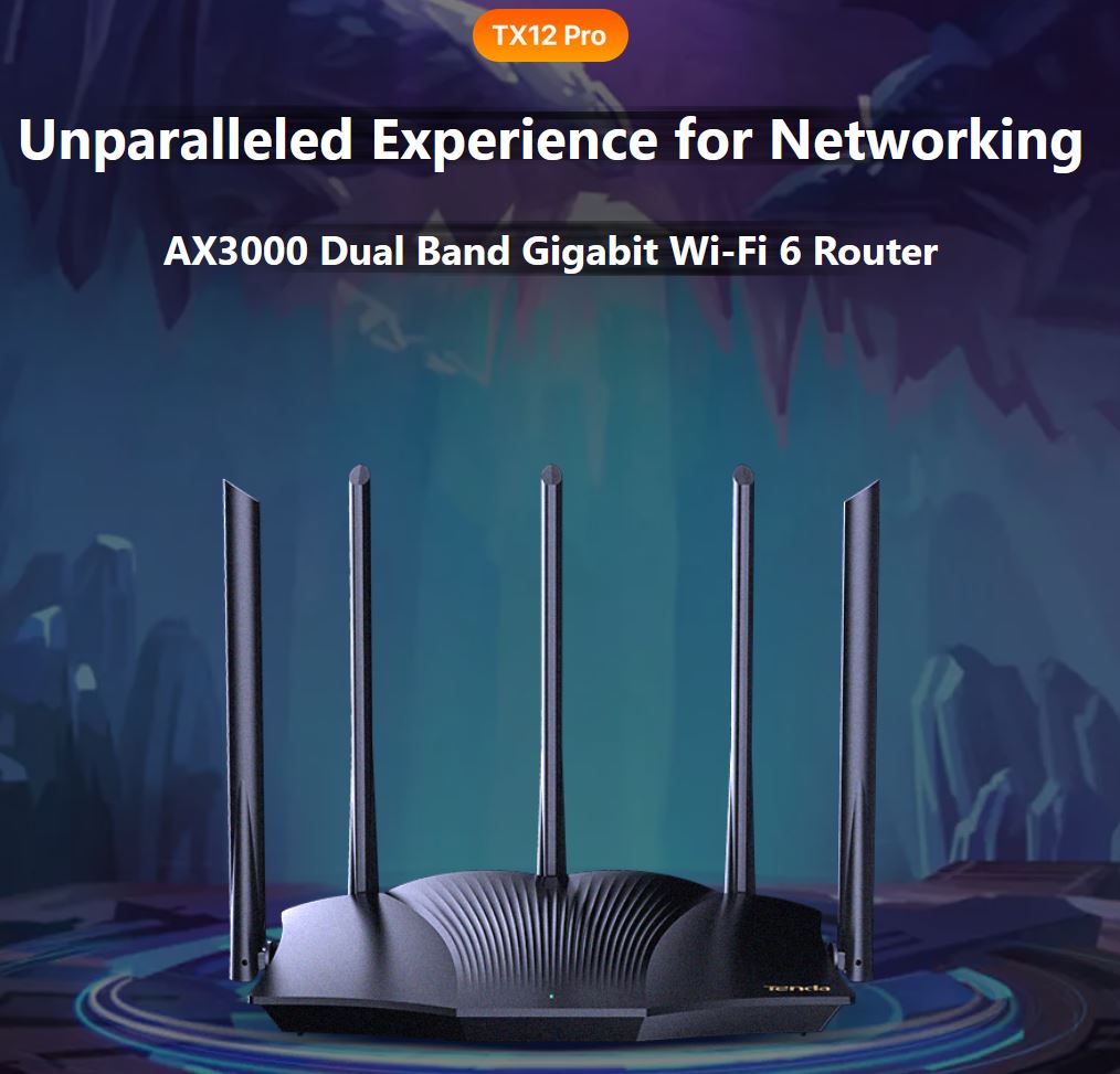 Tenda TX12 Pro AX3000 WiFi6 Router, 1x GWAN, 3x GLAN, IPv6, 5x 6dBi, WPA3, Mesh, CZ app