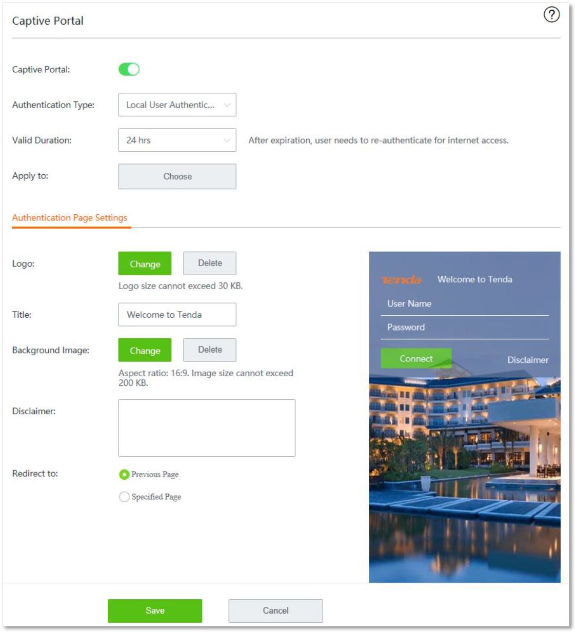 Router podporuje základní nebo vlastní Captive portal. Velkou