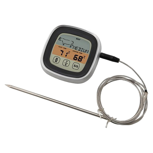Praktický digitální teploměr pro grilování, s odepínatelnou nerezovou sondou a dotykovým displejem pro snadné používání. U přístroje lze nastavit jak druh masa, tak požadovaný stupeň propečení, nebo použít jako časovač. Ovládání je řešeno praktickým dotykovým displejem a vypínání spolu s přepínačem teploměru a časovače na zadní straně zařízení.