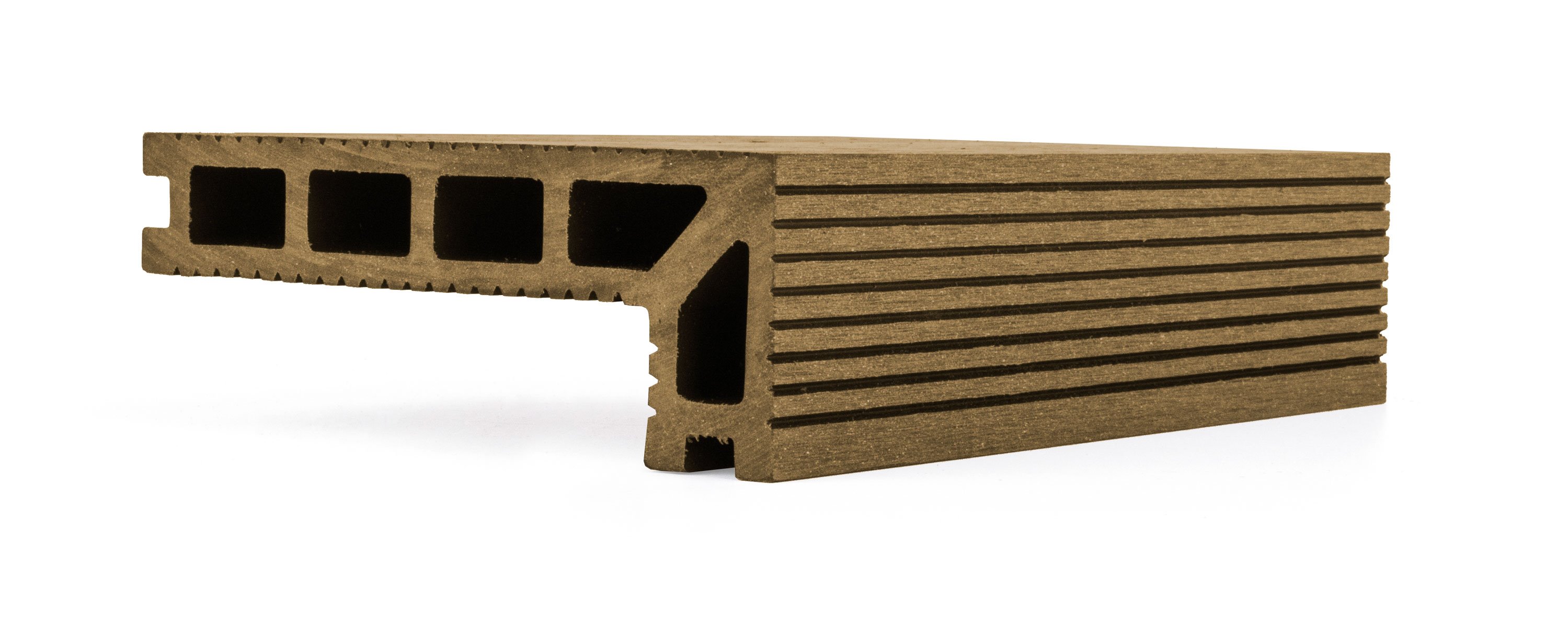 1) Nosník terasových prken – pokládá se napříč pod terasová prkna s roztečí 35 cm. Doporučená spotřeba: 3 m nosníku terasových prken na 1 m² terasového prkna.