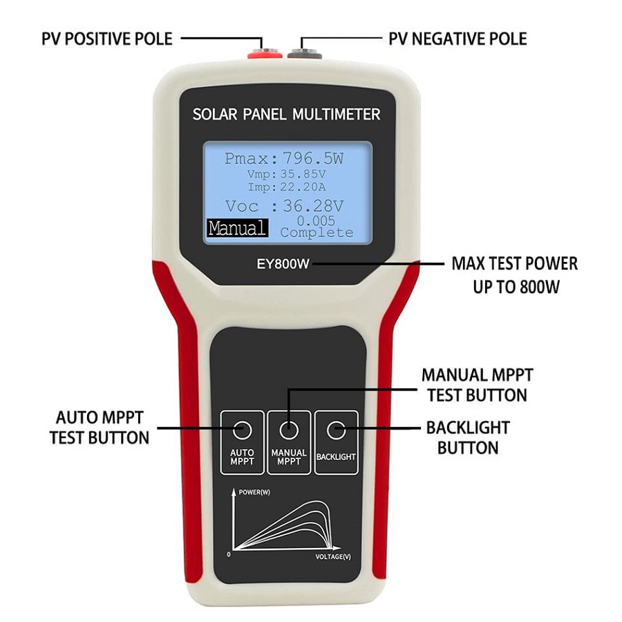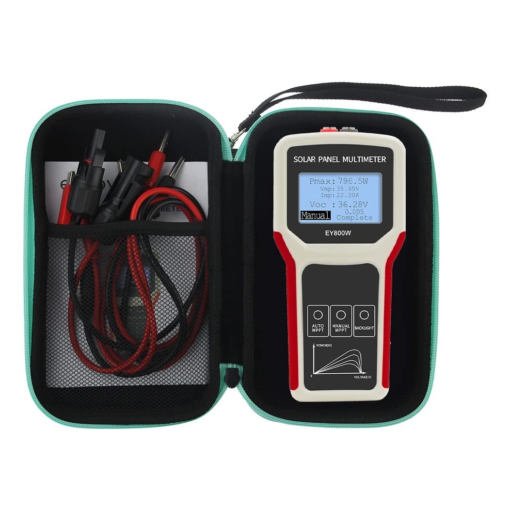 S testerem ELEJOY EY800W otestujete maximální napájecí bod výkonu a napětí naprázdno u solárních panelů. Multimetr se hodí každému výrobci a prodejci fotovoltaických panelů, instalačním firmám a uživatelům solárních panelů.