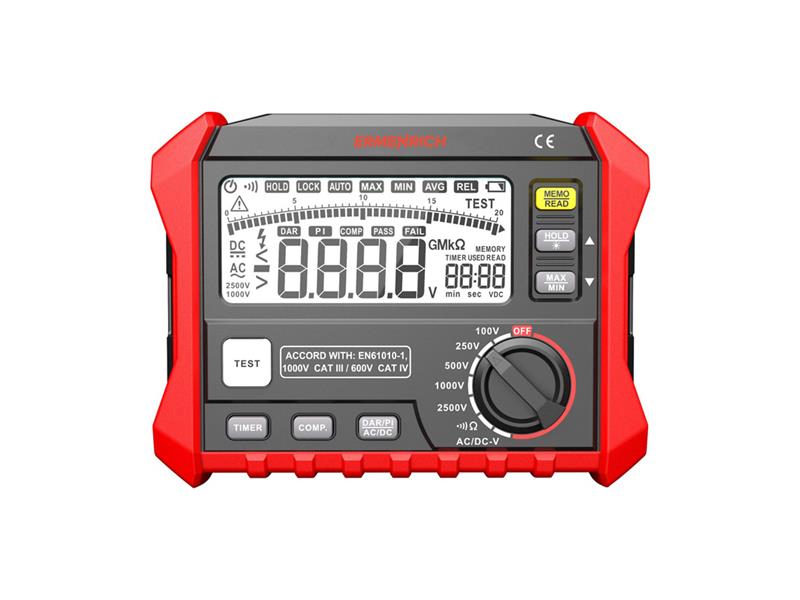 Ermenrich Ping ET50 je měřič izolačního odporu neboli megaohmmetr, který se používá ke kontrole kvality kabelů. Poškození nebo zhoršení izolace kabelu pod napětím může vést ke zkratům a požárům. Pravidelná kontrola pomocí megaohmmetru snižuje riziko vzniku takových nebezpečných situací. Přístroj pracuje s 5 testovacími napětími: 100, 250, 500, 1000 a 2500 V. Celkový rozsah měření odporu je od 0 do 200 GΩ.