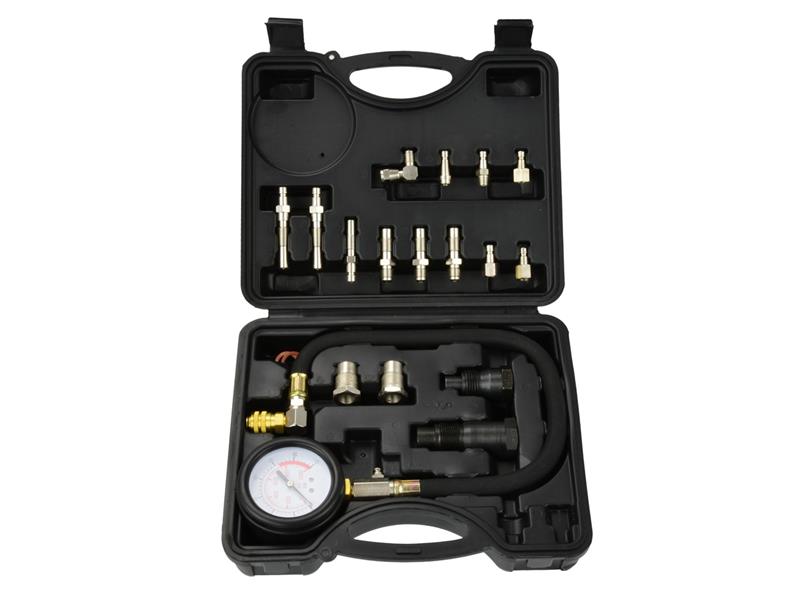 Tester pro kontrolu tlaku nafty. - Tlakoměr s rozsahem 0 - 70 BAR. - Elastická hadice o délce asi 400 mm, zakončená funkční rychlospojkou, která usnadňuje připojení jednotlivých měřicích hrotů. - Sada koncovek a měřicích adaptérů, které umožňují testování většiny dieselových motorů.