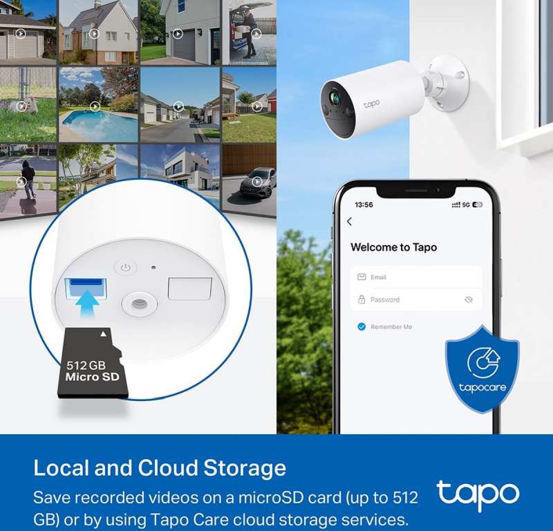 microSD až do 512 GB nebo ze zabezpečené cloudové služby Tapo Care