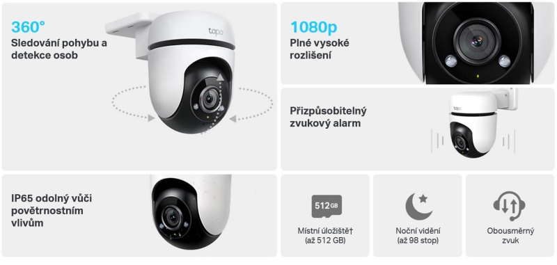 Tapo C500 IP kamera v provedení PTZ dome, disponuje 2 MP fixním objektivem (1920 × 1080, 15 fps) s fixní ohniskovou vzdáleností a snímačem 1/3". Nechybí ani slot na microSD karty do kapacity 512 GB, IR světlo na vzdálenost 30 m, audio mikrofon i reproduktor, krytí IP65 a integrovanou 2,4 GHz WiFi s vestavěnými anténami.