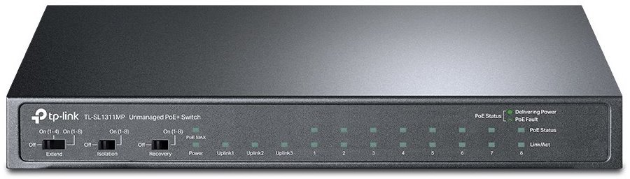 Switch značky TP-Link s označením TL-SL1311MP je velmi jednoduchý nemanagovatelný PoE switch s 8× 10/100 Mbps LAN, 2× Gigabit LAN uplink porty a jedním SFP portem. Switch podporuje napájení PoE 802.3af/at zařízení jako jsou kamery, VoIP, AP na prvních 8 portech s maximálním odběrem zařízení 30 W/port, maximálně 124 W na všech osmi portech…