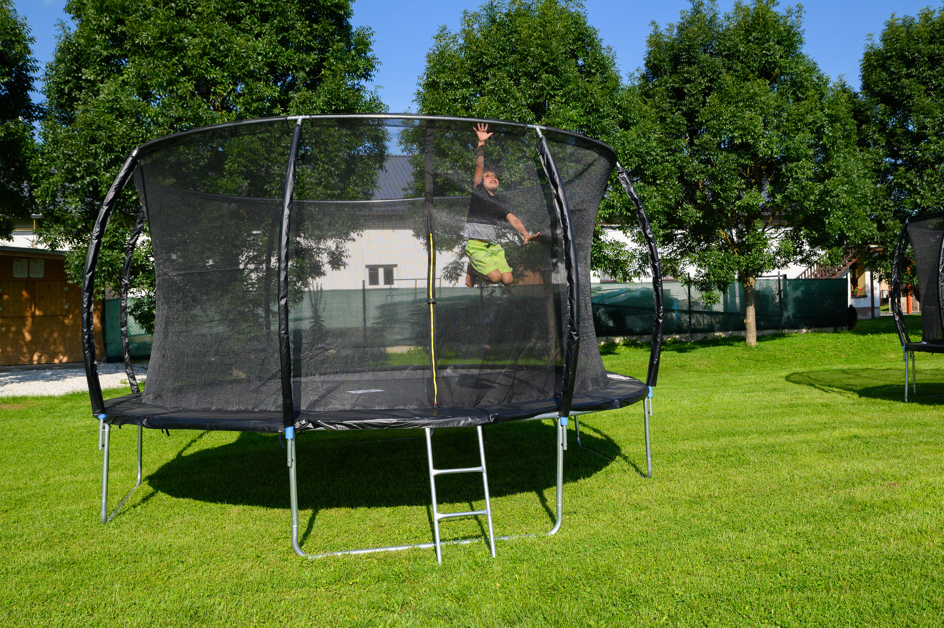 - Ochranná síť trampolíny je z vnitřní strany konstrukce, skákání na trampolíně je tak bezpečnější