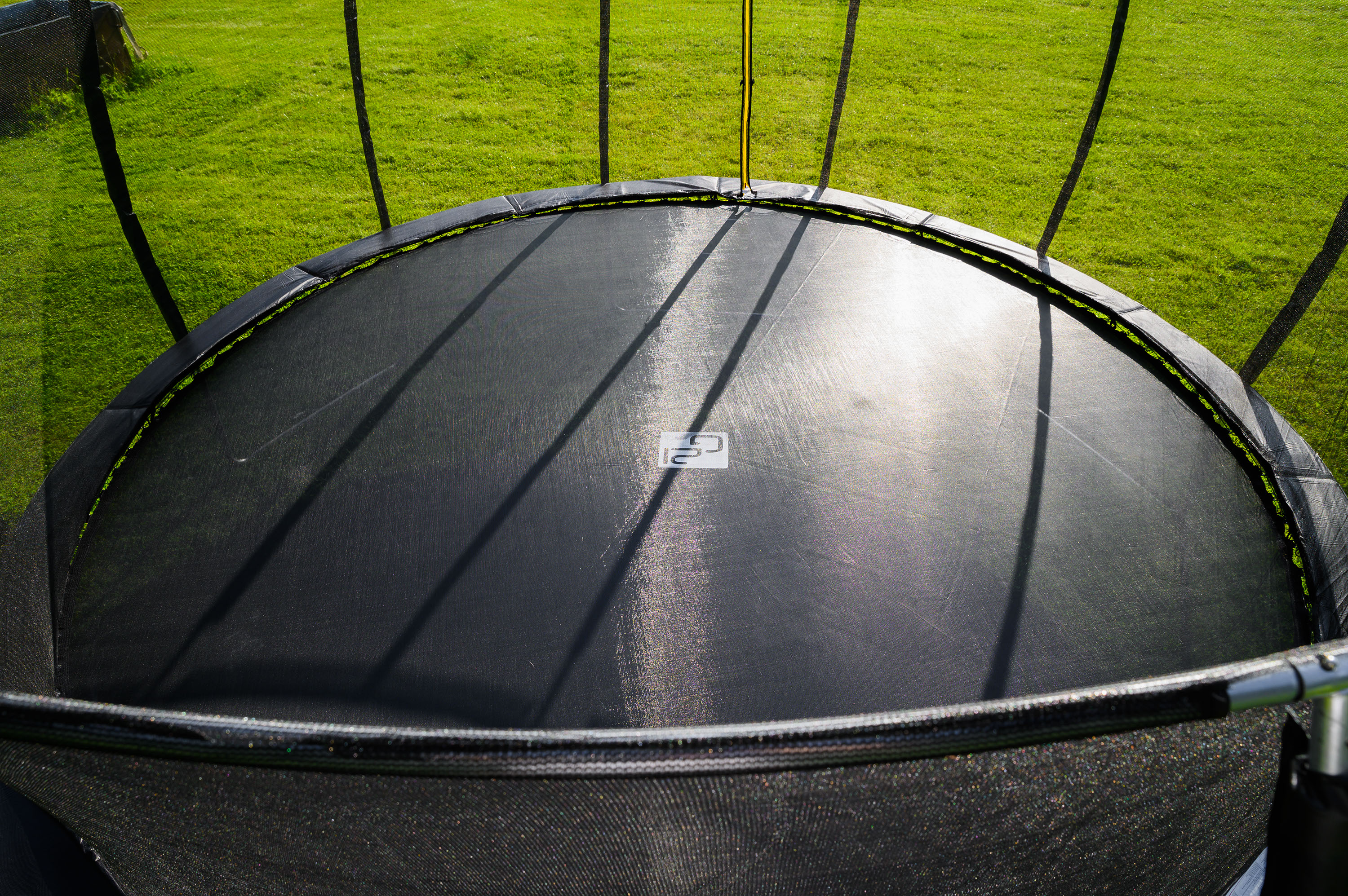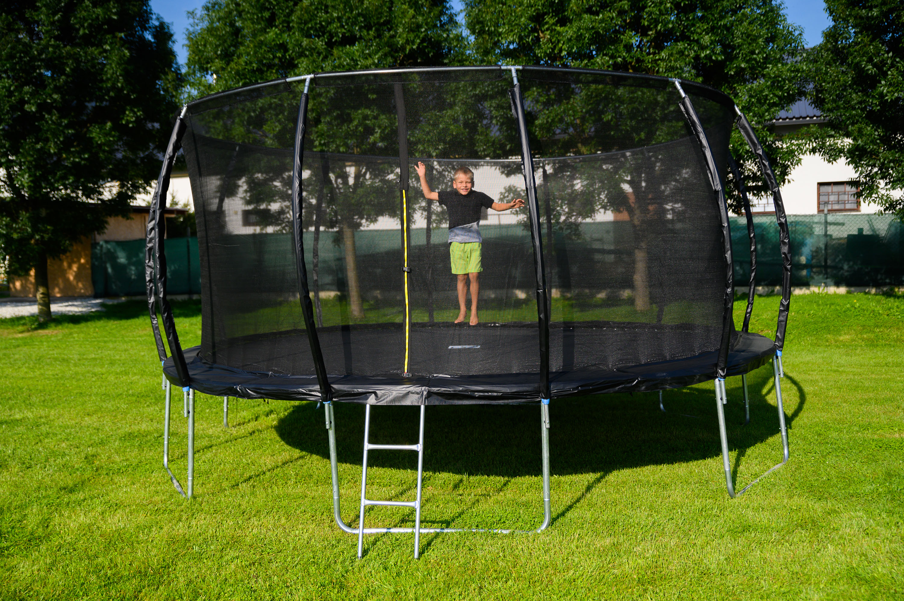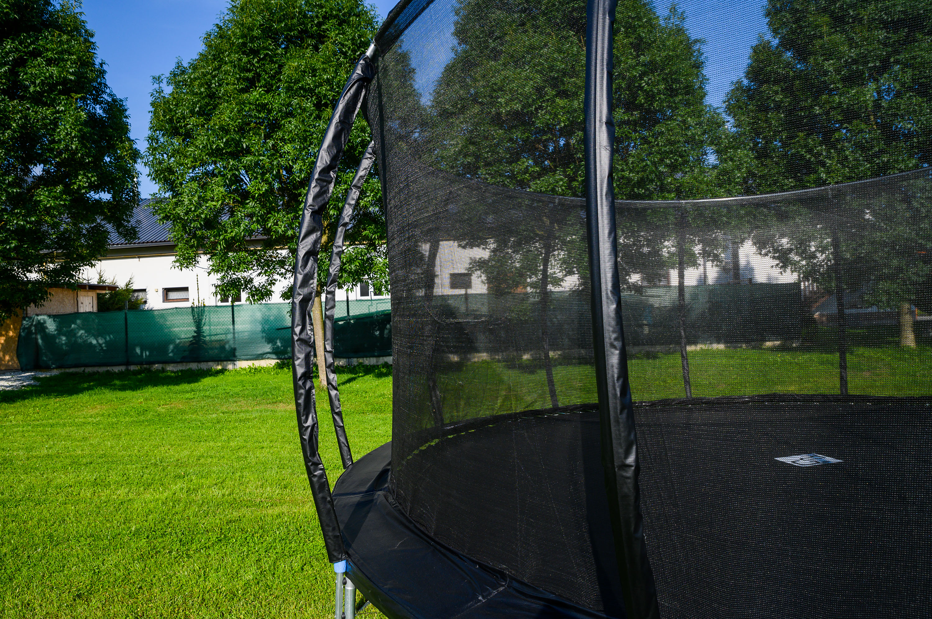 - Ochranná síť trampolíny je z vnitřní strany konstrukce, skákání na trampolíně je tak bezpečnější