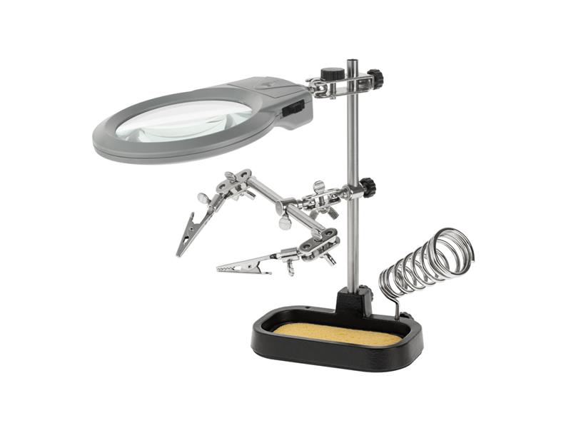 Třetí ruka KEMOT Technické parametry: - 2 nastavitelná ramena s klipsy (krokodýli) - Lupa (2D) - Velikost objektivu: 90 mm - 2 LED - Stojánek pro páječku - Mycí houba - Stojan - Napájení: 3x AAA baterie (nejsou součástí dodávky)
