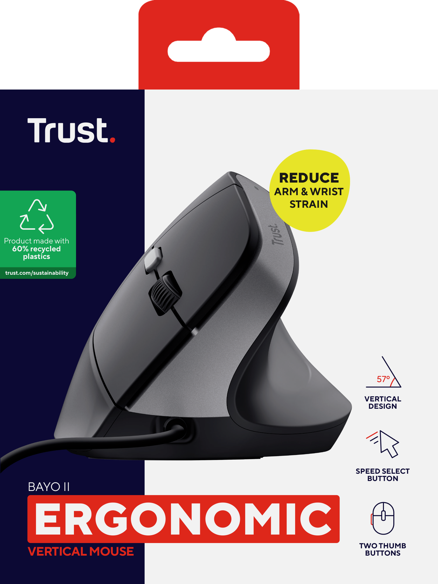 Trust Bayo II/ Vertikální/ Optická/ Pro praváky/ 2 400 DPI/ Drátová USB/ Černá