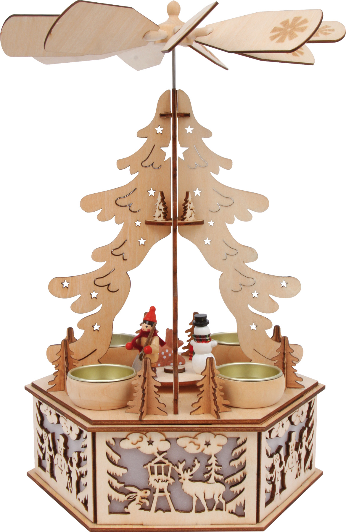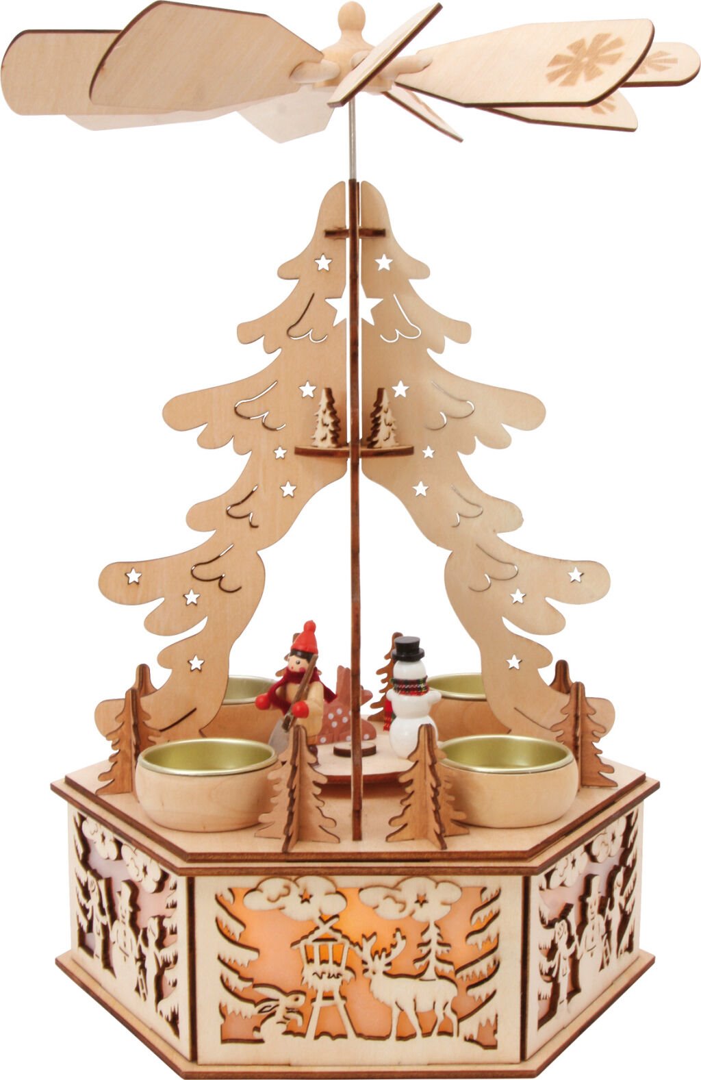 Vánoční dekorace s osvětleným podstavcem značky Small Foot. Čtyři svíčky roztáčí vrtuli, jejíž listy můžete natáčet, a upravovat tím rychlost otáčení. Osvětlení zajišťuje LED světlo, které napájí 2x AA baterie (nejsou součástí balení).