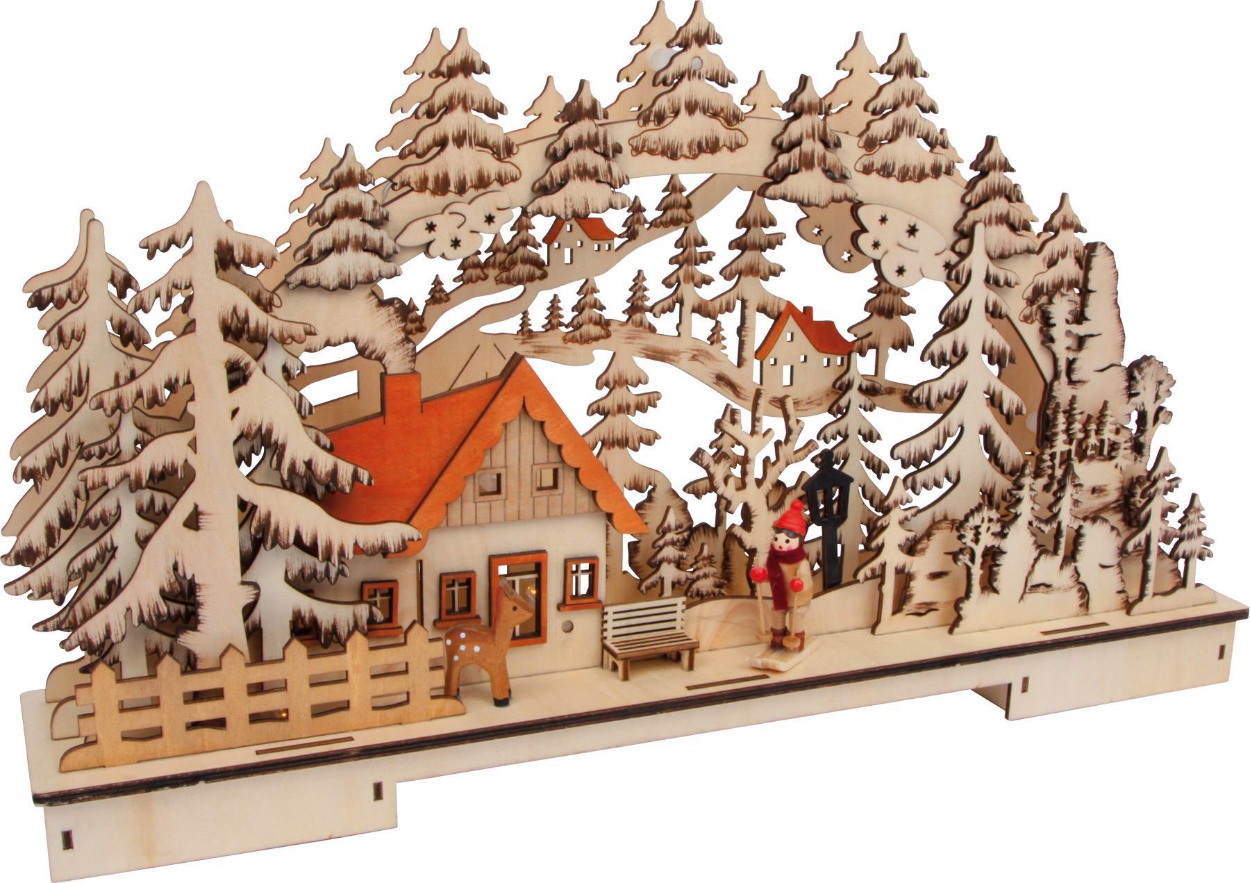 S touto bohatě zdobenou vánoční dekorací se vánoční duch nastěhuje i k vám domů, protože dokonale zútulní každý kousek vaší zahrady nebo domácnosti. Použité dřevo pochází z lesnických společností zapojených do zalesňování, což přispívá k zachování přirozeně rostoucích lesů i během Vánoc. LED diody poskytují nepřímé osvětlení, které má teplou žluto-oranžovou barvu a nebude tak dráždit vaše oči. O napájení se starají 2 AA baterie, což zjednoduší umístění celé dekorace a ještě více rozšíří možnosti vaší vánoční výzdoby.
