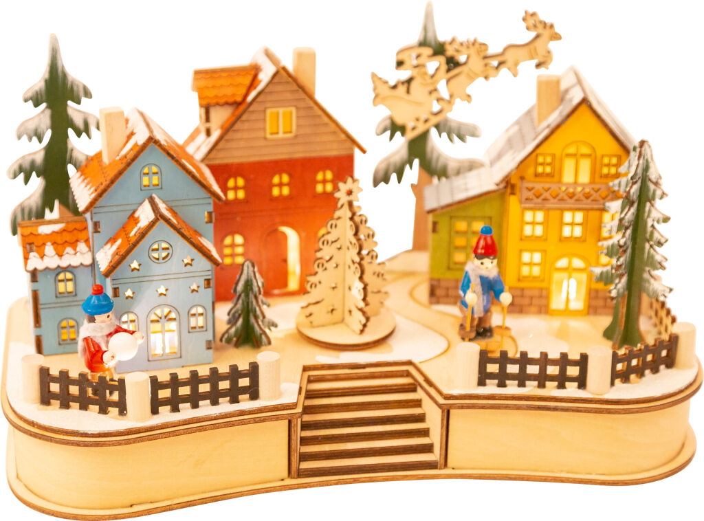 LED diody poskytují nepřímé osvětlení, které má teplou žlutou-oranžovou barvu a nebude tak dráždit vaše oči. O napájení malé vísky se starají 2 AA baterie, což zjednoduší umístění celé dekorace a ještě více rozšíří možnosti vaší vánoční výzdoby. Na návsi se nachází vánoční stromeček, který se po zapnutí lampy začne otáčet. Pozorní obdivovatelé této dekorace pak mohou spatřit Santu Clause i jeho pověstné saně. Barevné domky jsou vyrobeny s drobnými detaily z jemně vyřezávaného dřeva. Použité dřevo pochází z lesnických společností zapojených do zalesňování, což přispívá k zachování přirozeně rostoucích lesů i během Vánoc.