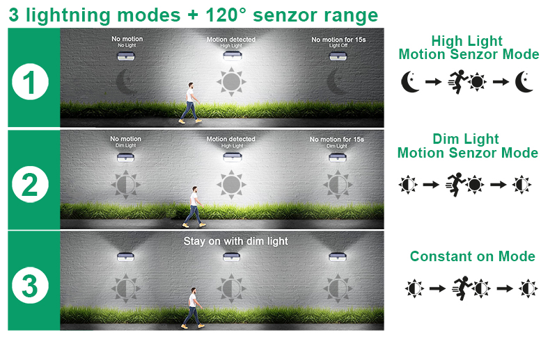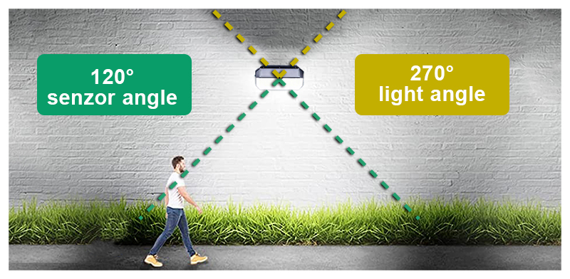 režimu vám LED světlovydrží svítit 8-12 hodin. Vestavěnýpohybový senzordetekuje pohyb v rozmezí od 3 do 5 m v pozorovacím úhlu 120°a zároveň dokáže rozpoznat falešný pohyb (pohyb větví, vítr, atd.)
