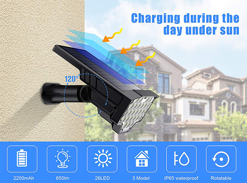 Zcela soběstačné a nezávislé venkovní solární LED světlo VIKING D26 - 26 LED diod se světelností 650 lm, kapacita baterie 2200mAh, doba svícení 8-15 hodin, solární napájení, instalace do země i na zeď, 3 režimy intenzity světla, celonoční svícení.