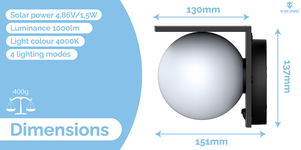 Svítivost 1000 lm • solární napájení • barva světla 4000K (denní bílá) • 4 režimy osvětlení • doba osvětlení za nevhodných podmínek více než 10 dní • odolnost IP54 • kapacita baterie 3,7V/7,4Wh • výkon solárního panelu 4,86V/1,5W