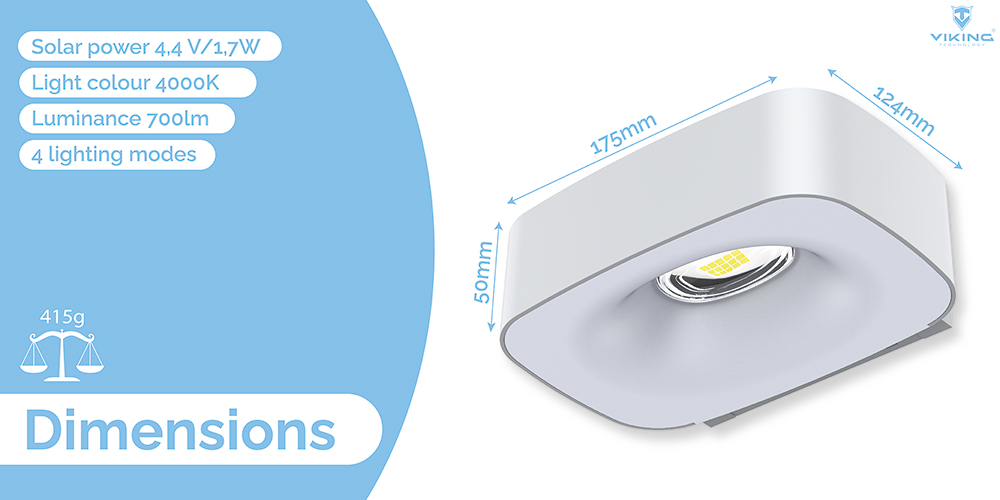 Svítivost 700 lm • solární napájení • barva světla 4000K (denní bílá) • 4 režimy osvětlení • doba osvětlení za nevhodných podmínek více než 7 dní • odolnost IP65 • kapacita baterie 3,7V/7,4Wh • výkon solárního panelu 4,4V/1,7W