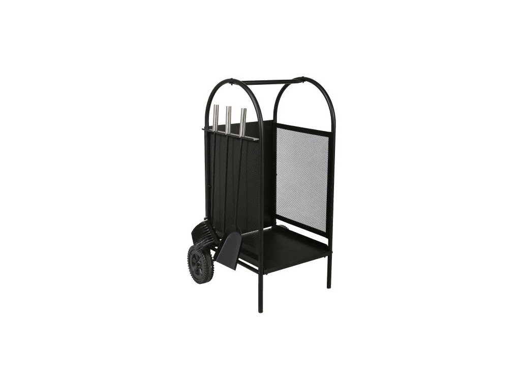 Vozík na dřevo s praktickým věšákem se zavěšeným krbovým nářadím je praktickým pomocníkem pro uskladnění dřeva u krbu.