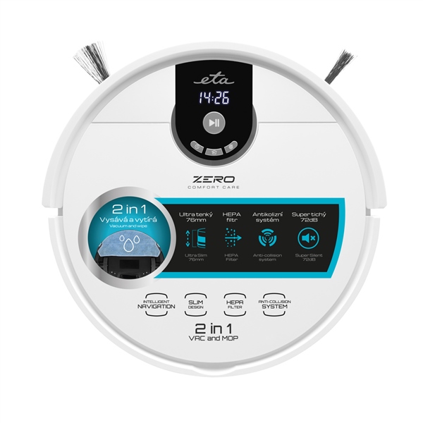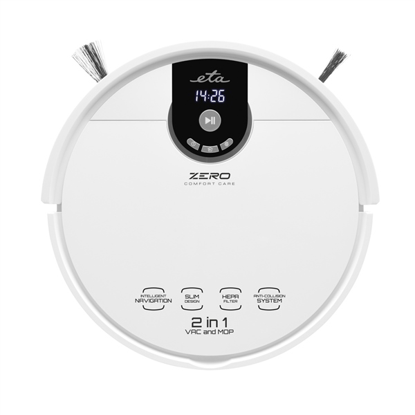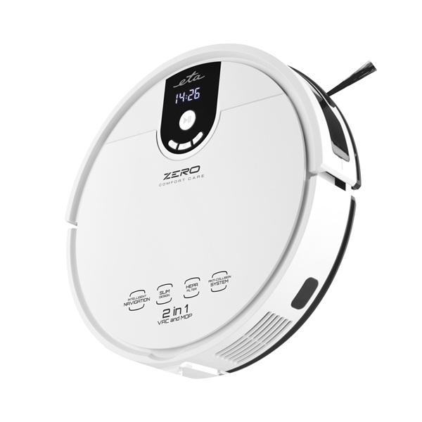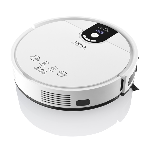 Praktický robotický 2v1 vysavač ETA Zero se postará o kompletní úklid vaší domácnosti či kanceláře i bez tahání velkých vysavačů či přepojování nepraktických kabelů, kdy na váš povel vysaje a vzápětí i důkladně vytře pomocí dodávaného mopovacího nástavce. Představuje ideální řešení pro všechny tvrdé podlahy i koberce s výškou vláken do 1,5 cm a se svým Super Slim designem a výškou pouhých 7,6 cm vysaje i pod velice nízkým nábytkem, takže hravě uklidí celý prostor. Všechny funkce vysavače snadno nastavíte na dálkovém ovládání a rovněž můžete nastavit úklid na konkrétní čas, takže bude pracovat i v době vaší nepřítomnosti, zatímco budete v práci, na výletě, na dovolené či kdekoliv jinde.