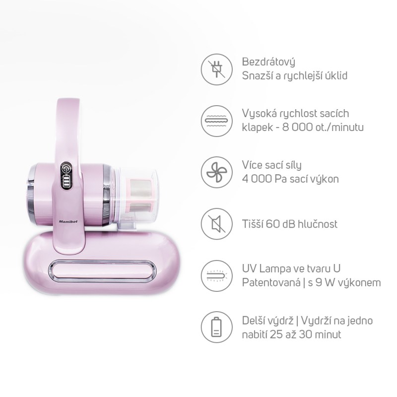 Mamibot UV Lite 100 je bezdrátový ruční vysavač určený pro likvidaci roztočů, bakterií a alergenů. Prostřednictvím patentované UV lampy likviduje 99,99 % roztočů, bakterií a alergenů.