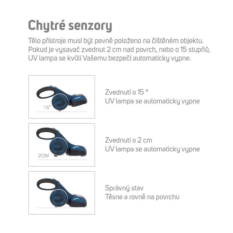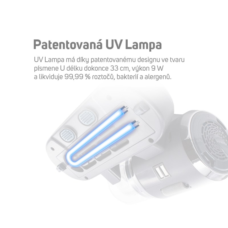 Po nasátí jsou všechny roztoče, bakterie a alergeny osvíceny UV lampou s výkonem 9 W. Laboratorní testy dokazují účinnost 99,99 % jejich likvidace. I když má UV lampa automatický ochranný systém, nikdy ji při používání nesměrujte na zvířata, nebo na lidi. Mohlo by dojít k poranění.