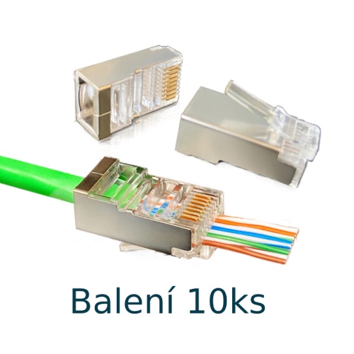Koncovka FTP RJ-45EZ, balení 10ks, krimpovací, licna i drát Konektor RJ45 stíněný průchozí, na síťový kabel (lanko), konektor určený k nalisování (krimpování). 8 pozic 8 kontaktů