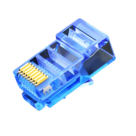 Barevná - průhledná modrá - koncovka (konektor) RJ45, určená pro Cat5e - lanko/licna. Možno použít i na drát, konektor typu 8P8C (8 pozici a 8 kontaktů).