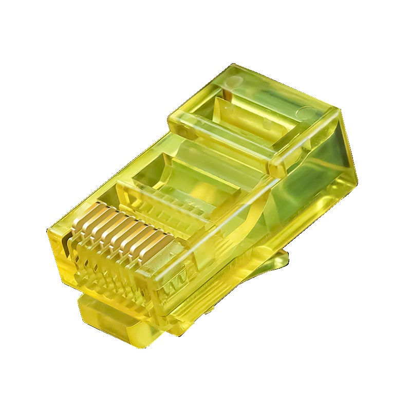 Barevná - průhledná žlutá - koncovka (konektor) RJ45, určená pro Cat5e - lanko/licna. Možno použít i na drát, konektor typu 8P8C (8 pozici a 8 kontaktů).