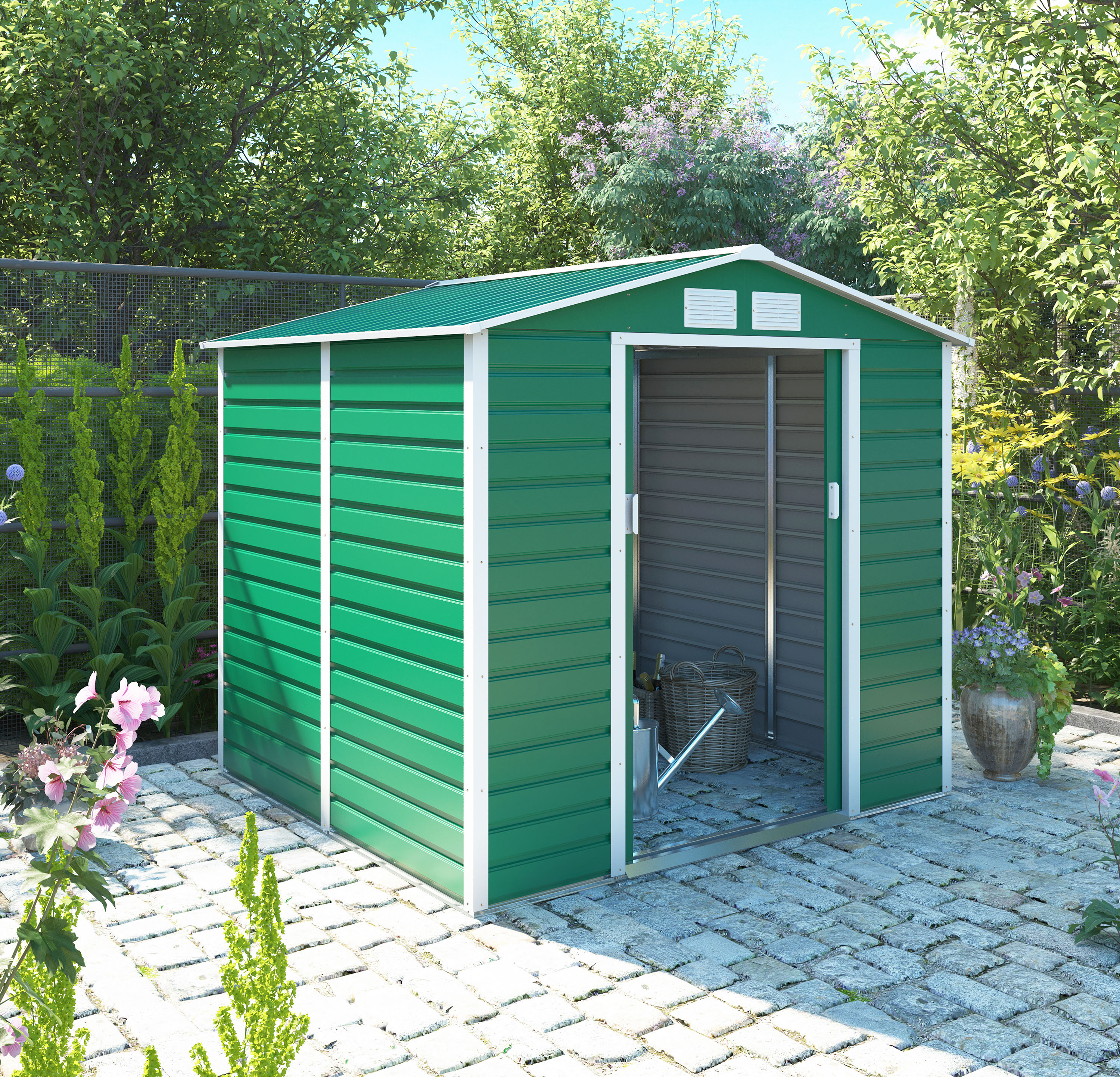 Na pevný pozinkovaný rám přimontujete ocelový, pozinkovaný plech s práškovým nástřikem, který je odolný vůči špatnému počasí. Součástí balení jsou dveřní úchyty, díky kterým domek snadno zajistíte proti nezvaným hostům.