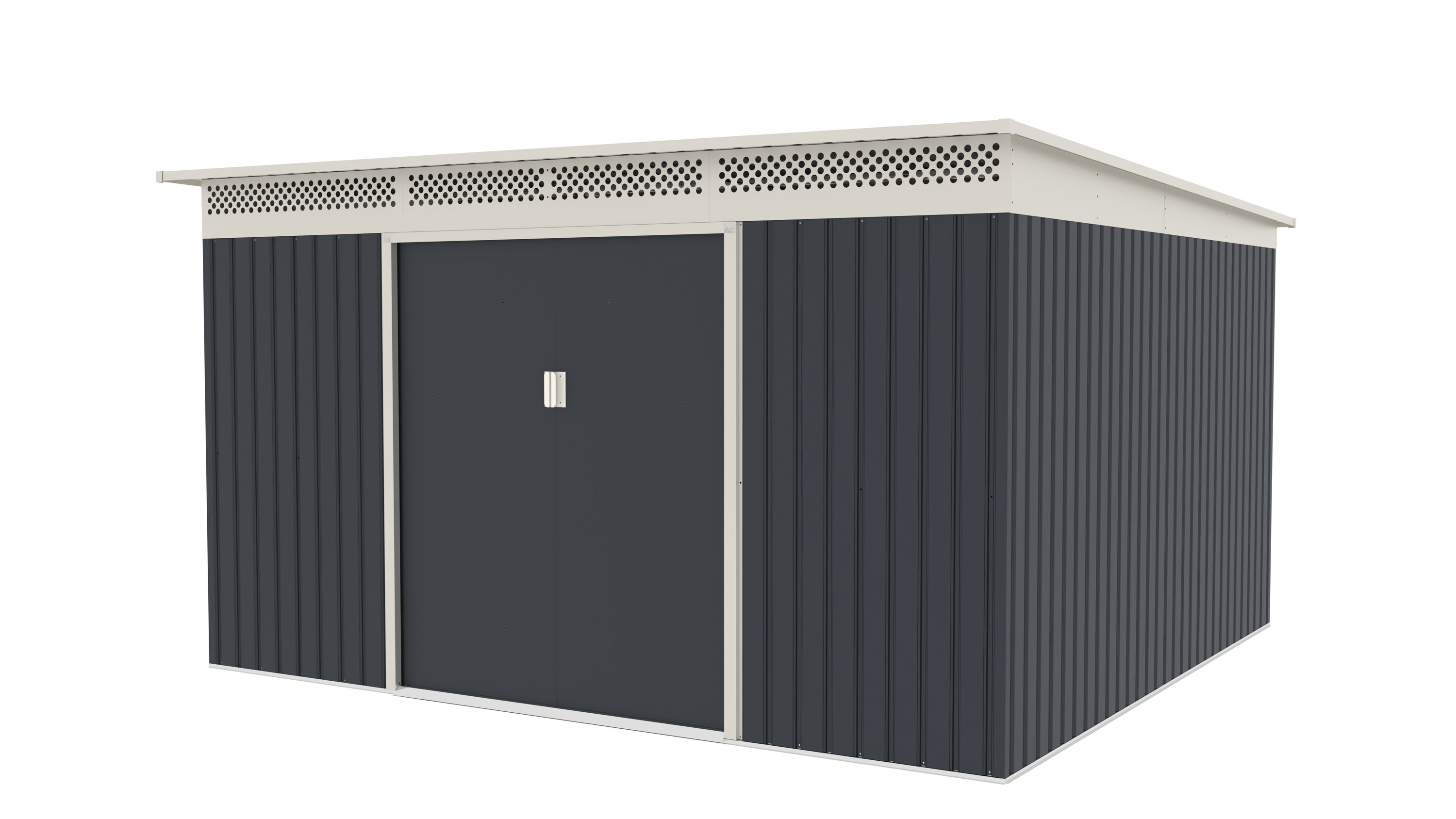 Zahradní domek GRAH 1132 má dvoukřídlé dveře o celkové šířce 138 cm. Vstup do domku je tak opravdu pohodlný, i když nesete nebo vynášíte objemnější věc.