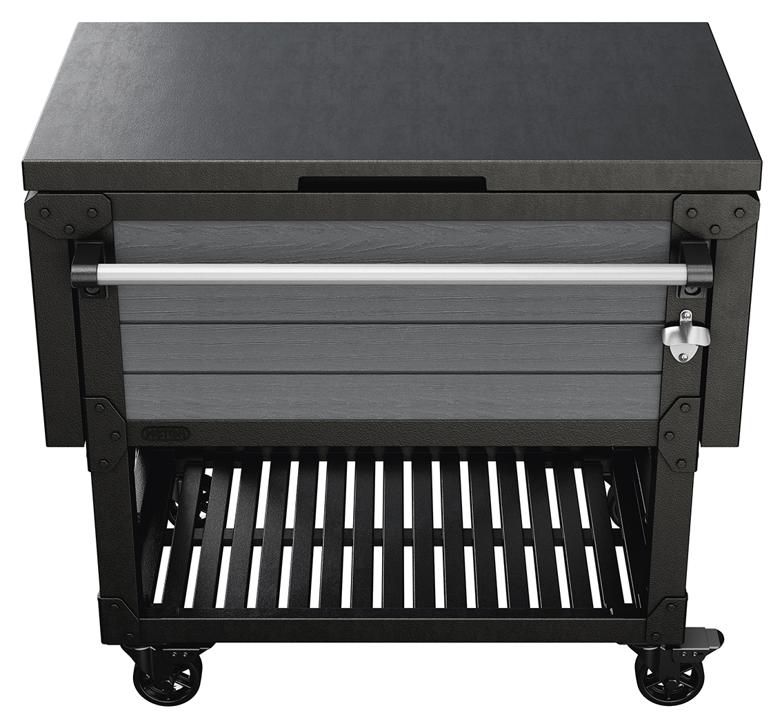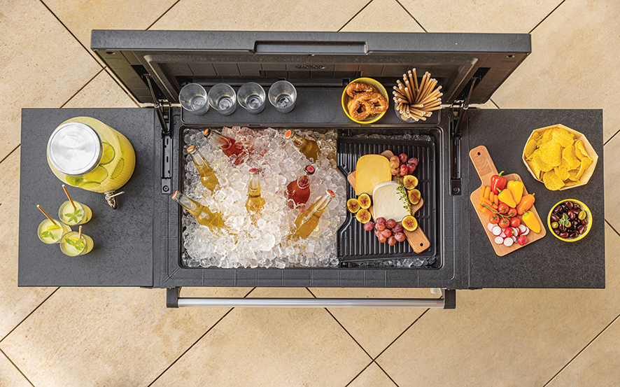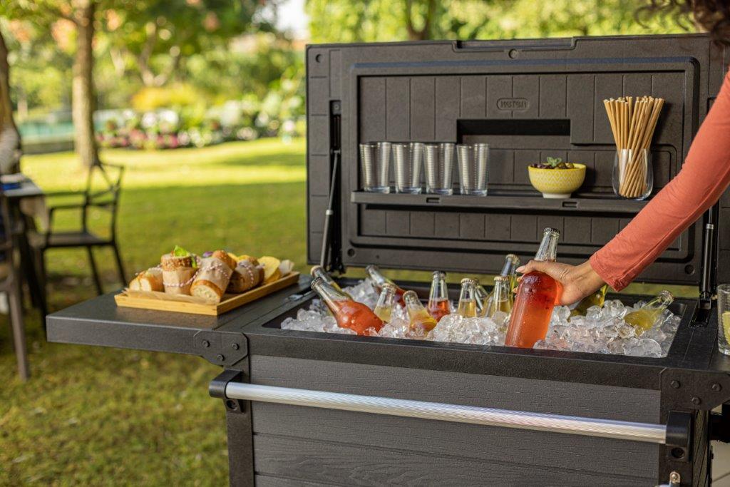 Vnitřní část stolu využijete jako úložný prostor. Můžete do něj nasypat led a vychladit láhve s pitím. Pohyblivou přepážkou oddělíte kostky ledu od jídla. Nebo ji vyndáte a použijete ji jako tác. Součástí stolku je také otvírák na lahve.