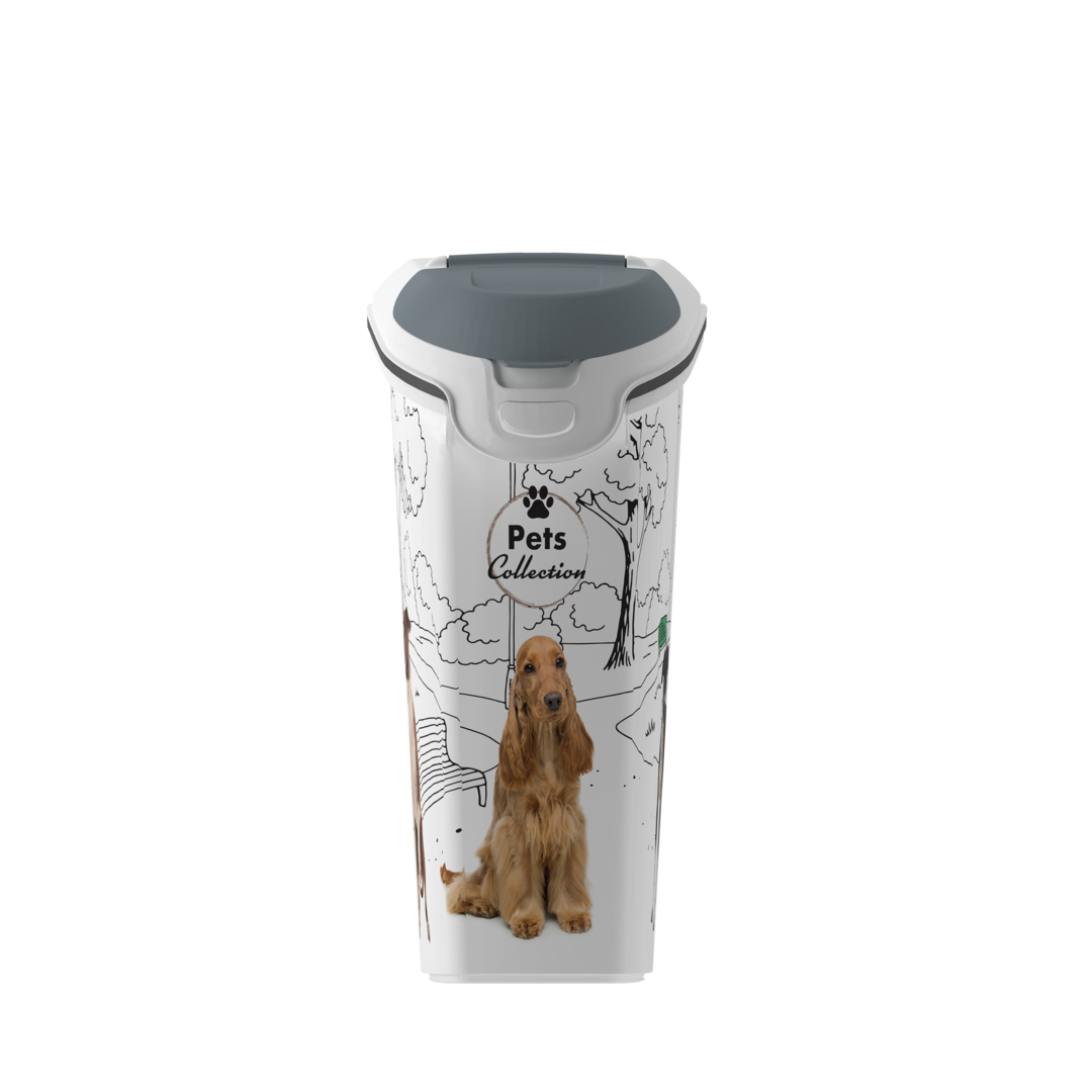 Praktický zásobník na suché krmivo Curver 03882-L29 s motivem teriéra a německého ovčáka perfektně těsní. Díky tomu zabraňuje šíření pachu a zabraňuje cirkulaci vzduchu uvnitř. Suché krmivo zůstane po delší dobu čerstvé, plné důležitých živin a vitamínů. To všechno za pomoci hermetickému uzavření. Uložený obsah nezmění barvu ani svoje typické aroma. Zásobník má speciální víko s důmyslným designem pro snadné plnění, které lze otvírat 2 způsoby. Pokud patříte mezi ty, kteří přesně dávkují krmivo svým mazlíčkům, ulehčí vám to vnitřní stupnice. Kompaktní rozměry a odolná rukojeť usnadní manipulaci a přenášení. Zásobník potěší svým designem i samotného pejskaře. Jeho objem je 23 l což představuje uložení až 10 kg granulí.