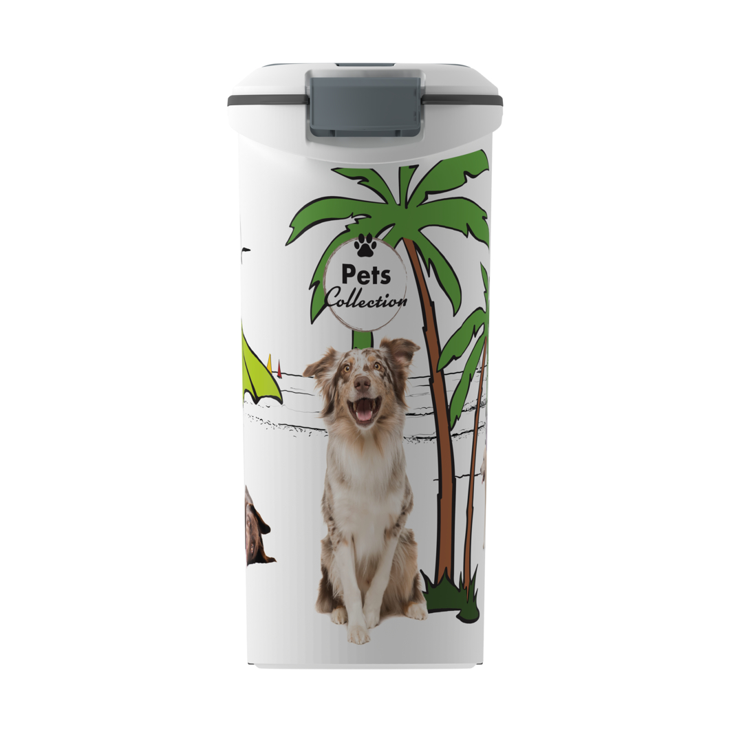 Kontejner má speciální víko s důmyslným designem pro snadné plnění, které lze otevírat 2 způsoby. Součástí je také vnitřní stupnice pro přesné dávkování, které tak bude vždy odpovídat správnému množství. Zásobník je vybavený kolečky pro snadný převoz, takže jej bez obtíží přemístí důchodci i větší děti. Psí motiv zaručeně potěší každého pejskaře, kdy je vepředu vyobrazený zlatý retrívr za kterým je moře s loďkami a vedle něj palmy, na straně se nachází další kamarád.