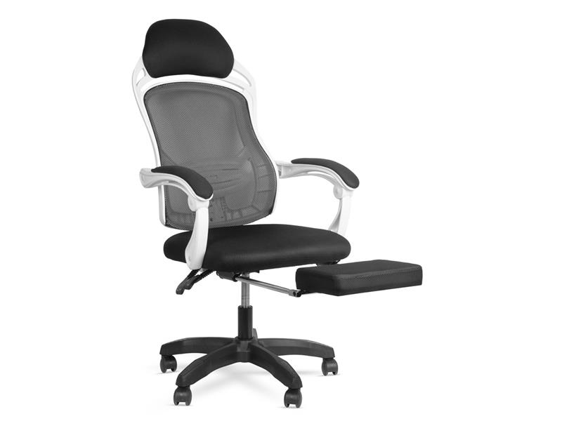 Moderně vypadající, ergonomicky tvarovaná kancelářská otočná židle s područkami, podnožkou a 10 cm polstrováním sedáku. Opěrka i sedací část byly vyvinuty tak, aby podporovaly správné držení těla. Vyztužená bederní opěrka udržuje pás ve správné poloze, čímž zabraňuje bolestem zad při dlouhodobé práci vsedě. Zabudovanou opěrku na nohy lze otevřít a zavřít v okamžiku.